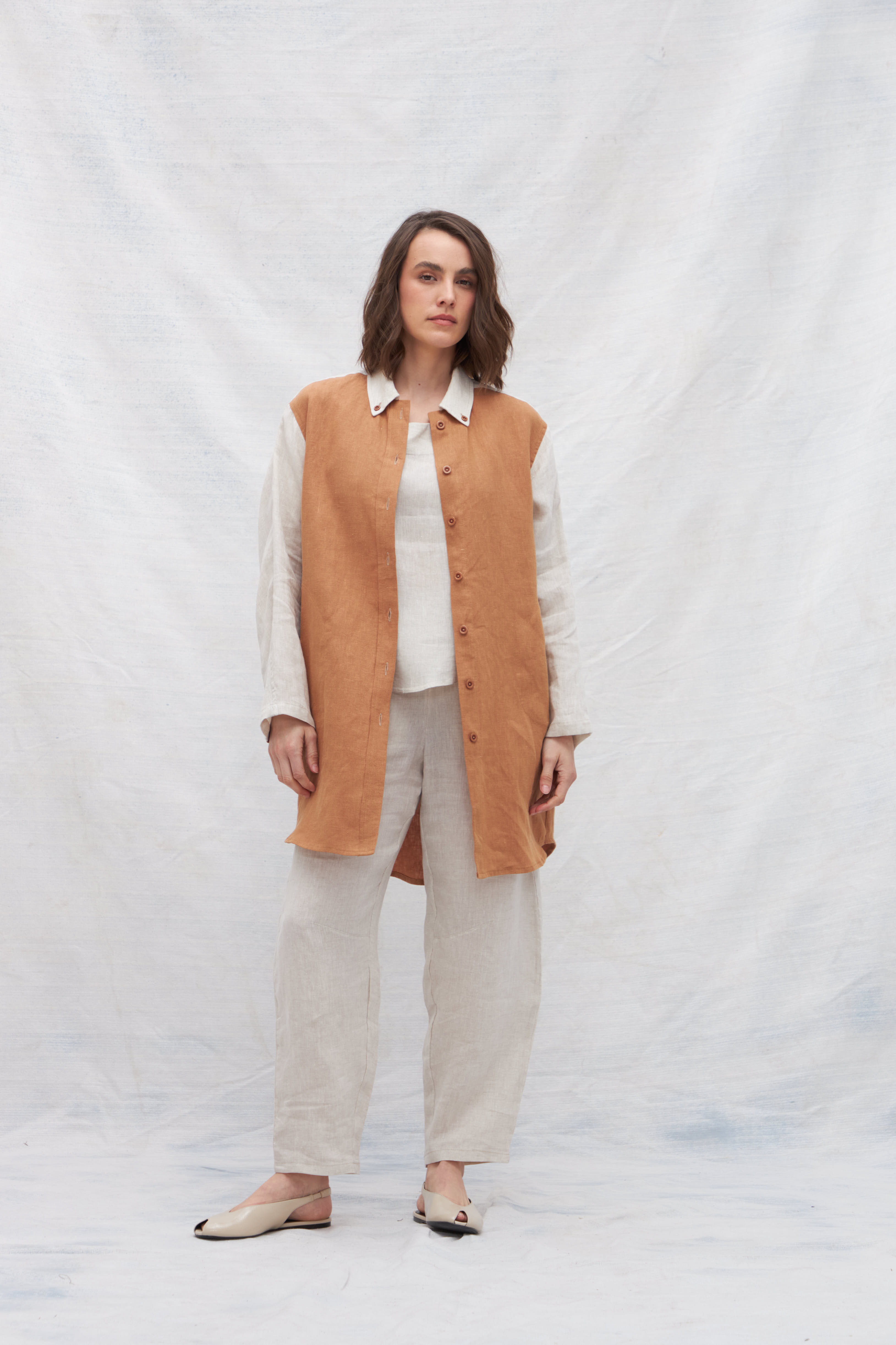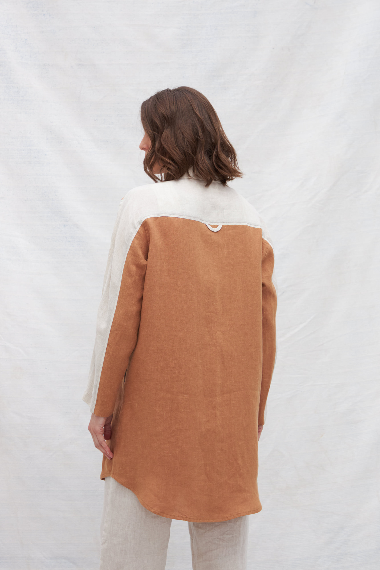 Camisa larga de lino con manga larga y bolsillos laterales. Lleva una franja en la espalda y mangas a contratono que suman un detalle de color. Puede usarse cerrada como camisa o abierta como abrigo liviano de verano.