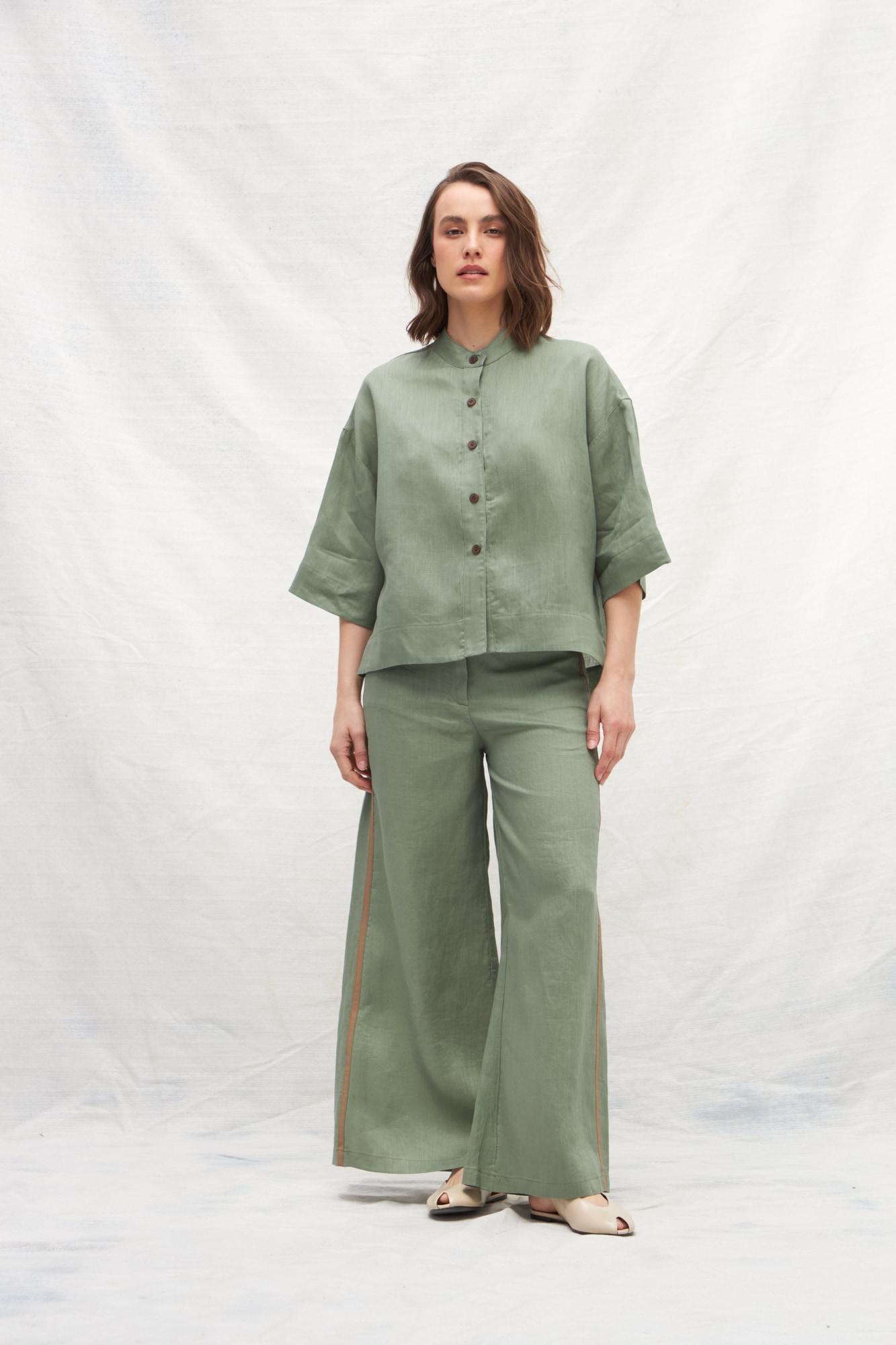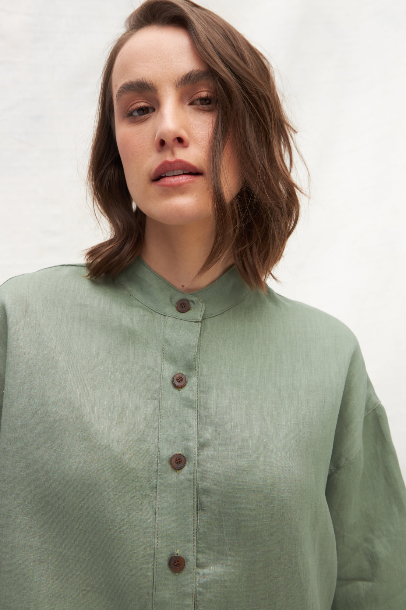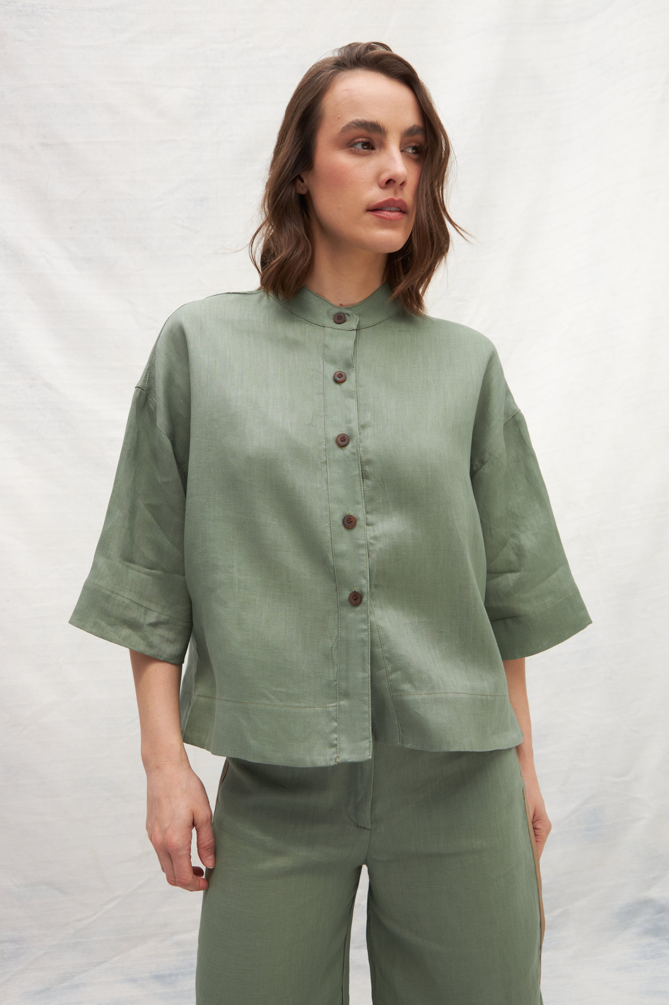 Camisa de lino de manga corta con cuello mao. Tiene canesú en la espalda y un ruedo curvo que aporta un calce relajado y versátil. Se puede usar con la manga remangada para darle un aire más casual.