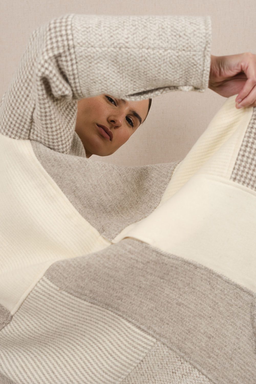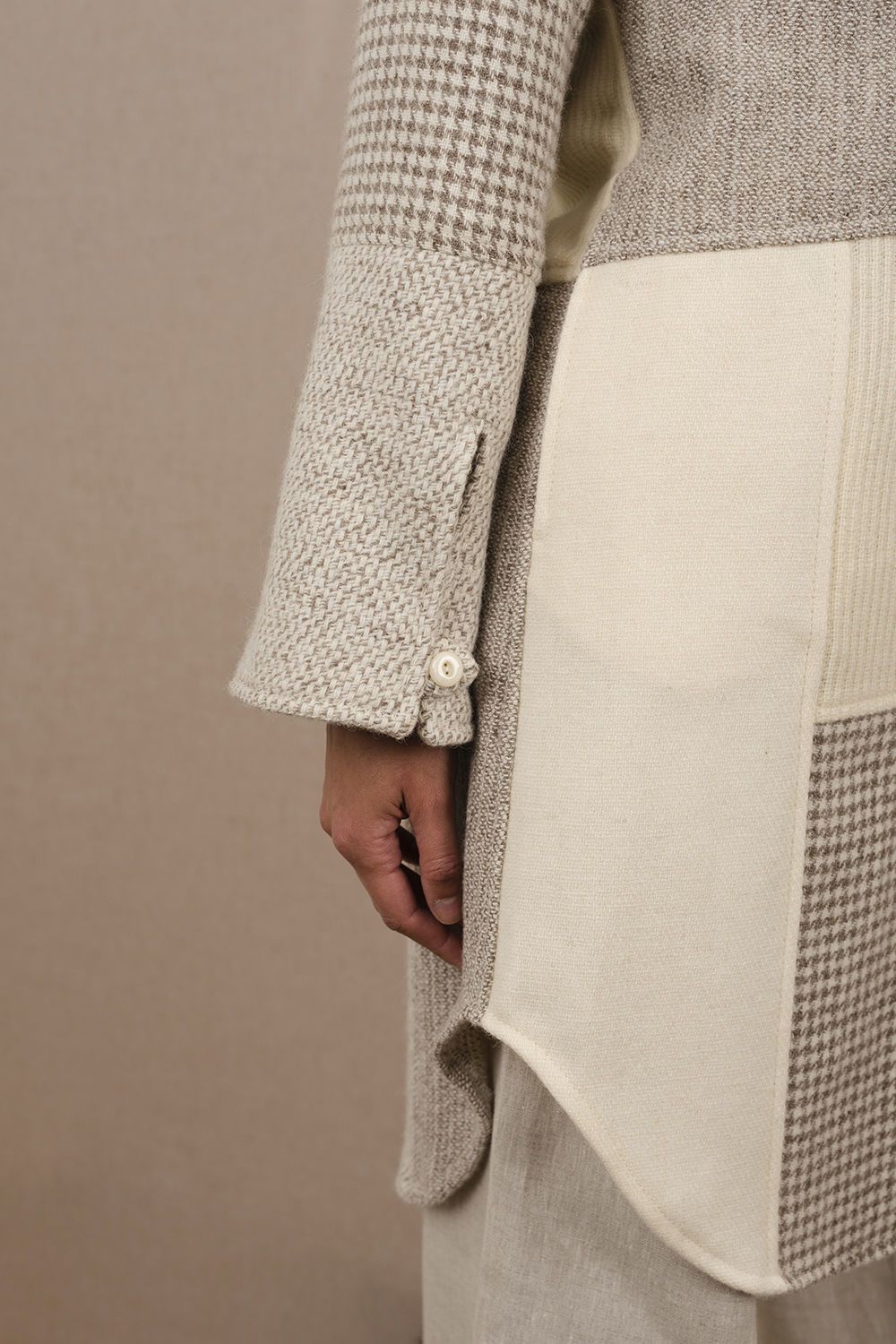 Camisa larga con cuello Mao, y manga con tajo y detalle con botón . Realizada con un mix de telas diseñadas exclusivamente por Don Baez. Prenda liviana, descontracturada, para usar todo el año. Tela 100% lana fina sin teñir. Hecho en Uruguay.