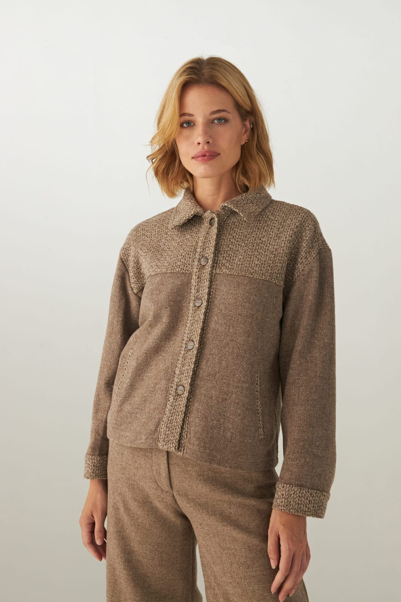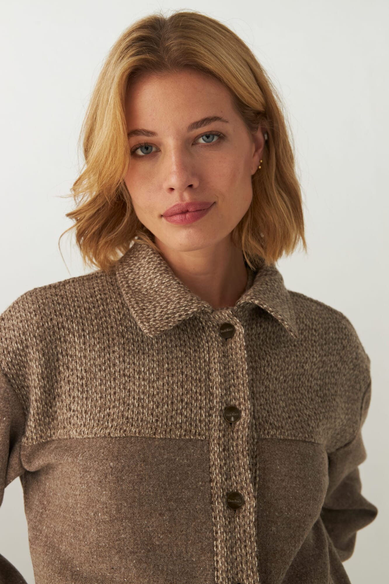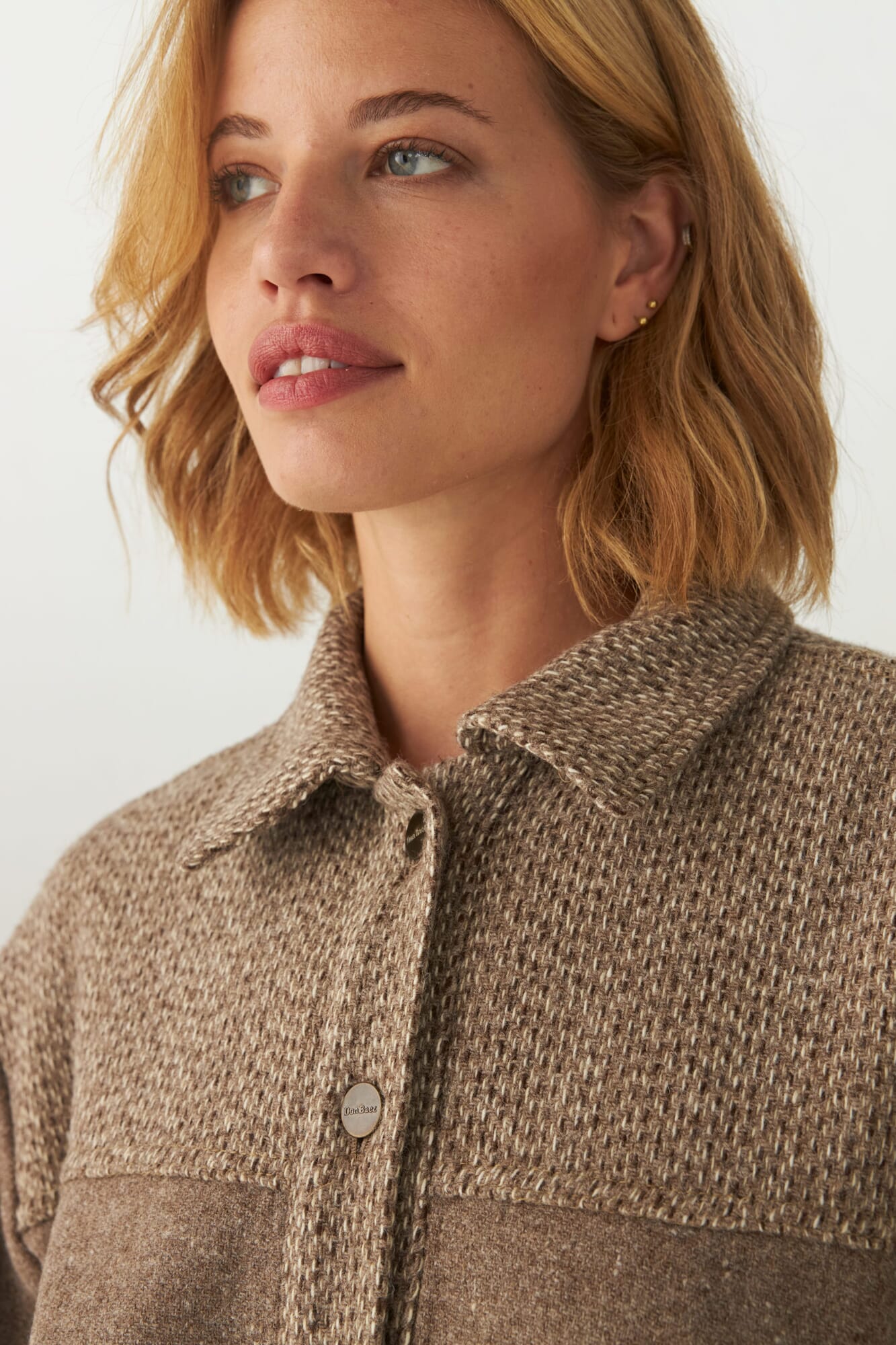 Campera corta, de corte jeanero, con combinación de telas, botones de metal con logo Don Baez. Tela 100% lana fina sin teñir, diseñada exclusivamente por Don Baez. Hecha 100% en Uruguay