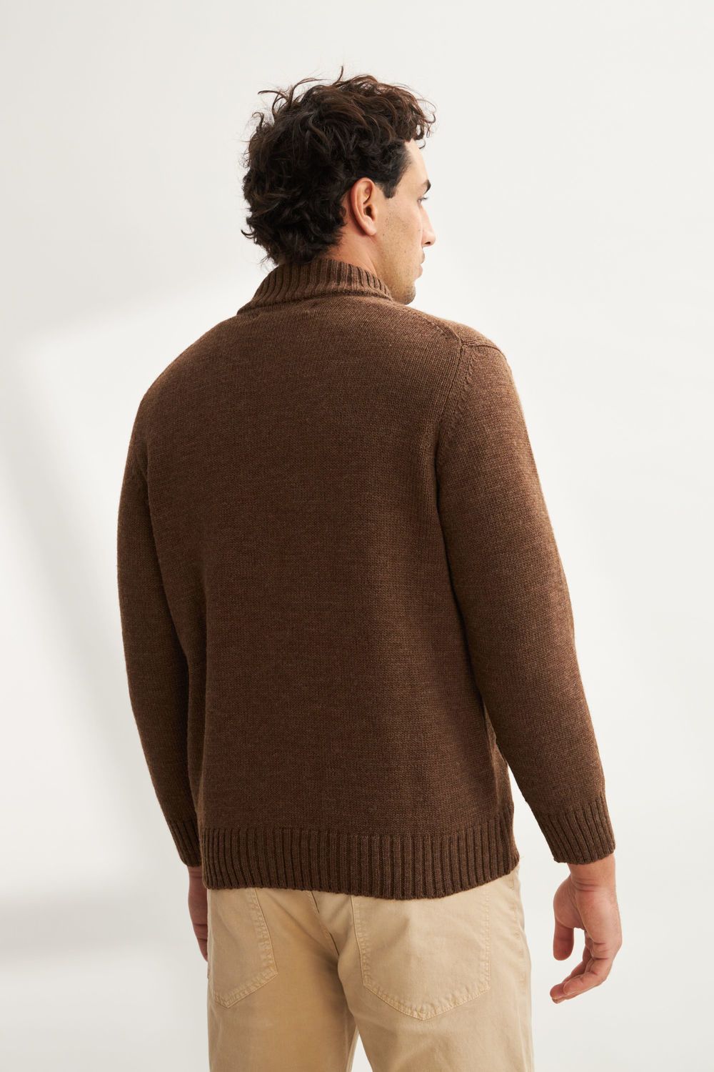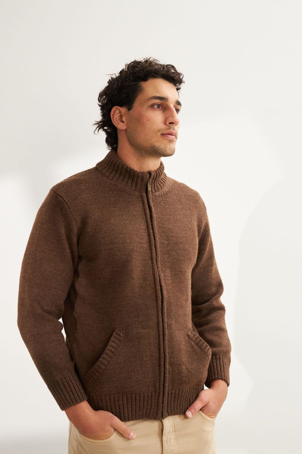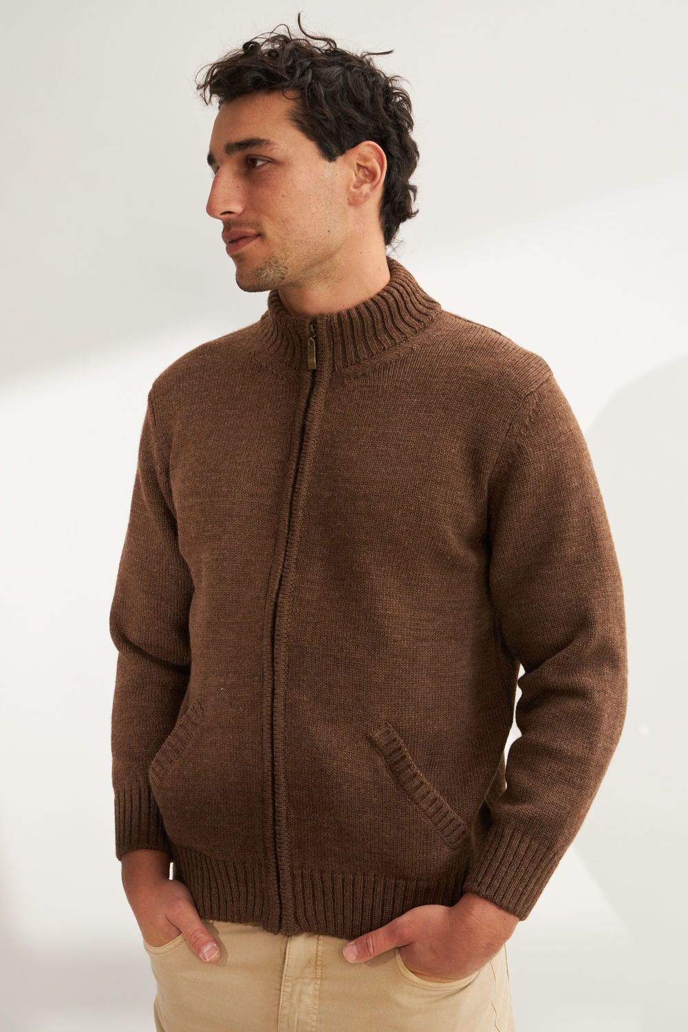 Campera tejida con cierre delantero, cuello alto y bolsillos delanteros. Clásica campera de