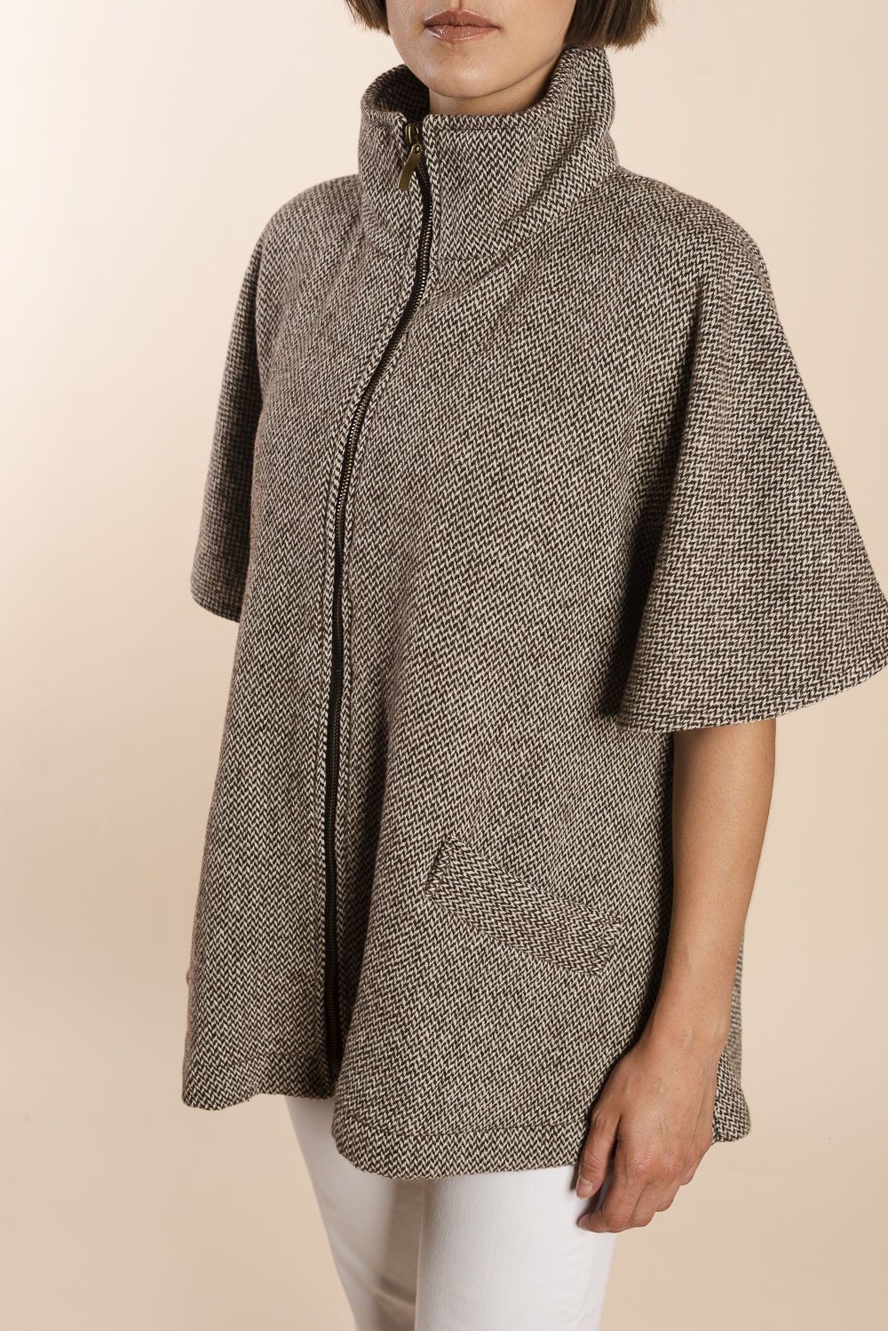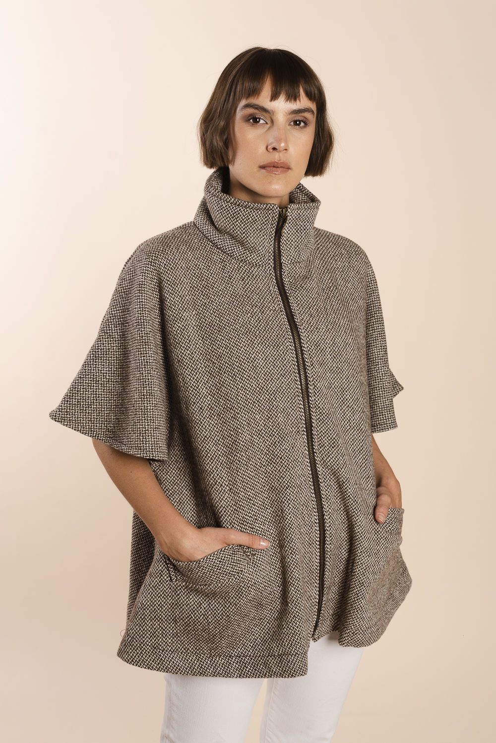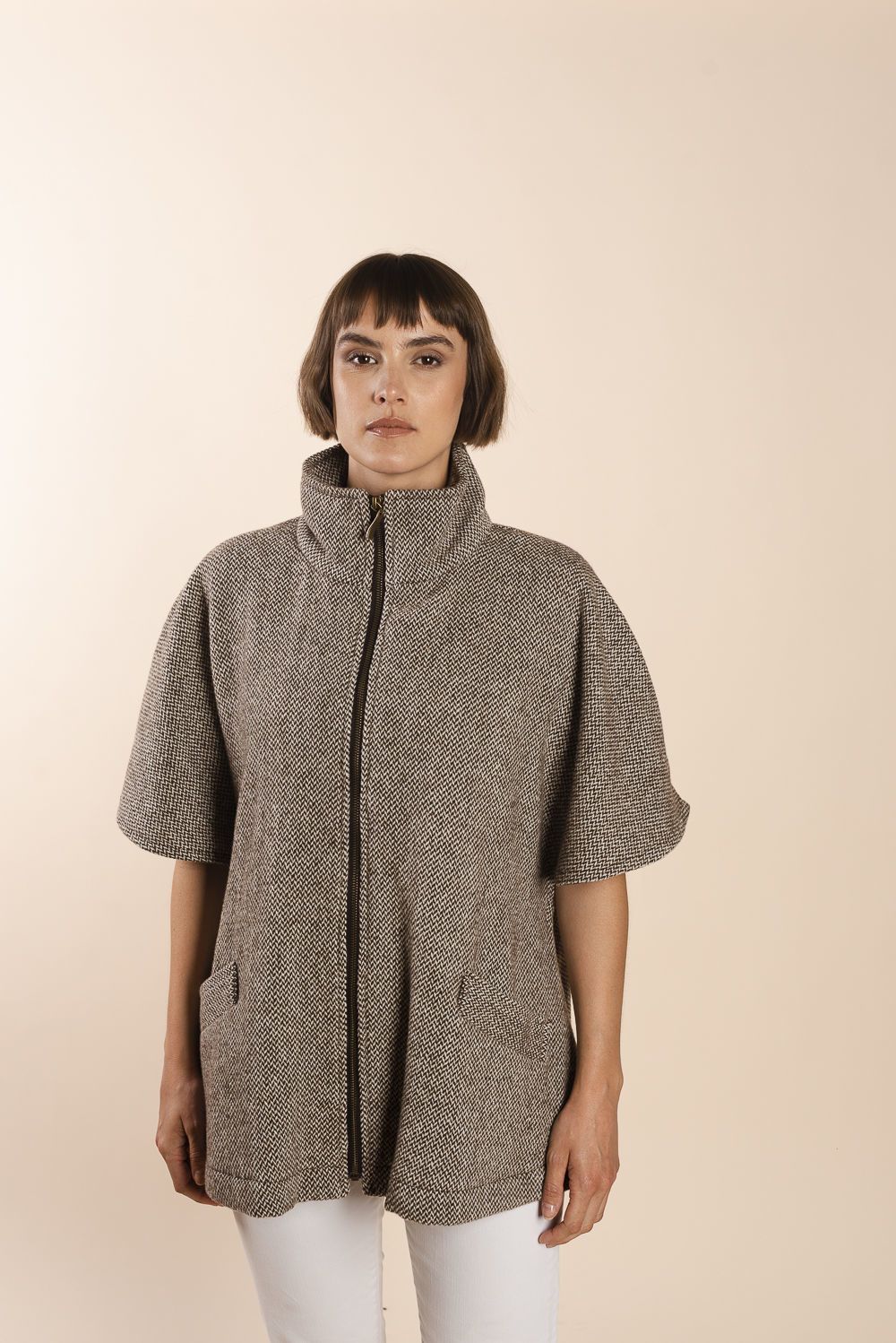 Capa acampanada con manga corta, cierre metálico a la vista, cuello recto y bolsillos con tapa. Terminaciones envivadas. Prenda informal, de uso diario. Se puede usar todo el año. Tela 100% lana fina sin teñir, diseñada exclusivamente por Don Baez. Hecha 100% en Uruguay.