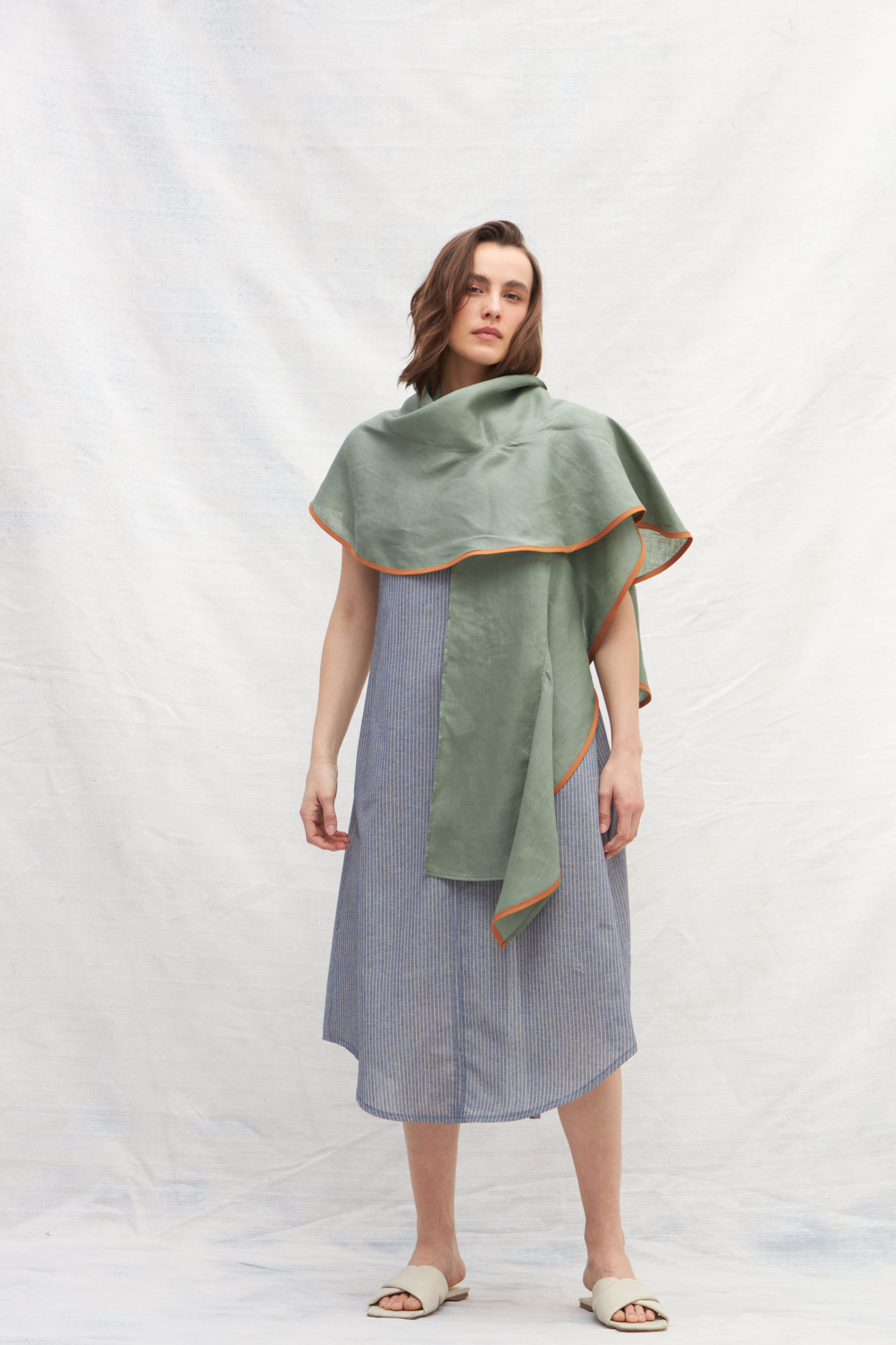 Chal de lino inspirado en la forma de espiral, con mucho movimiento y un detalle de color en el ruedo. Su diseño versátil permite usarlo extendido como chal o enroscado como un cuellito.