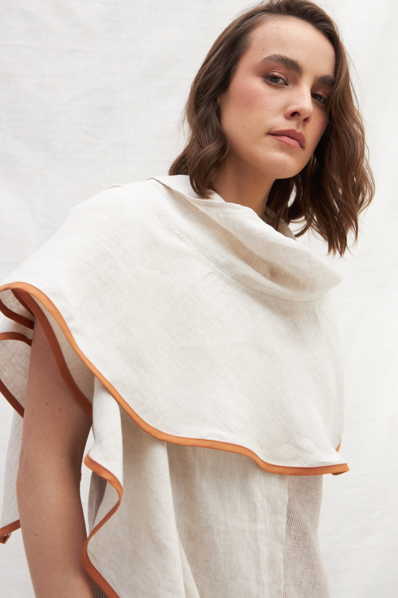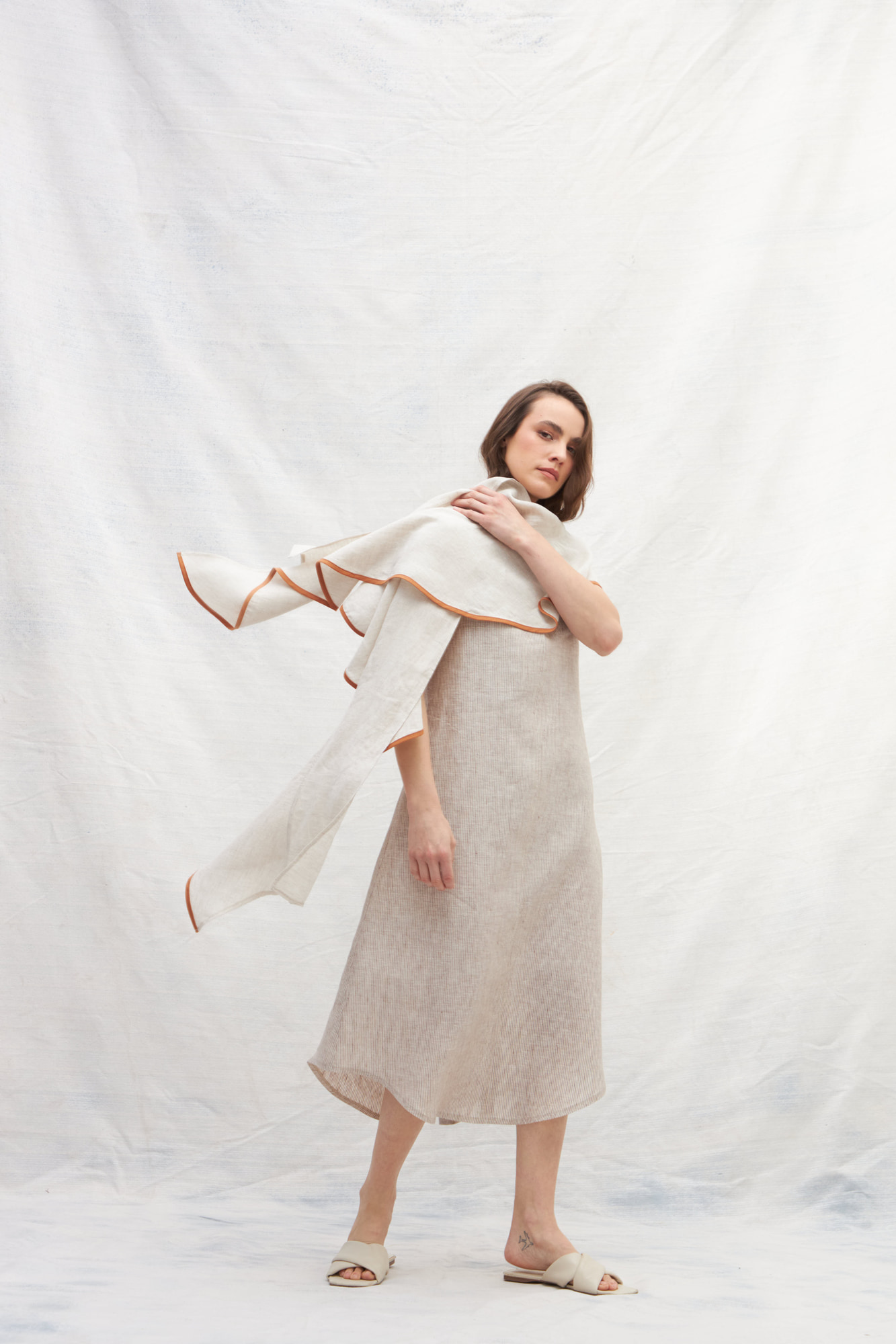 Chal de lino inspirado en la forma de espiral, con mucho movimiento y un detalle de color en el ruedo. Su diseño versátil permite usarlo extendido como chal o enroscado como un cuellito.
