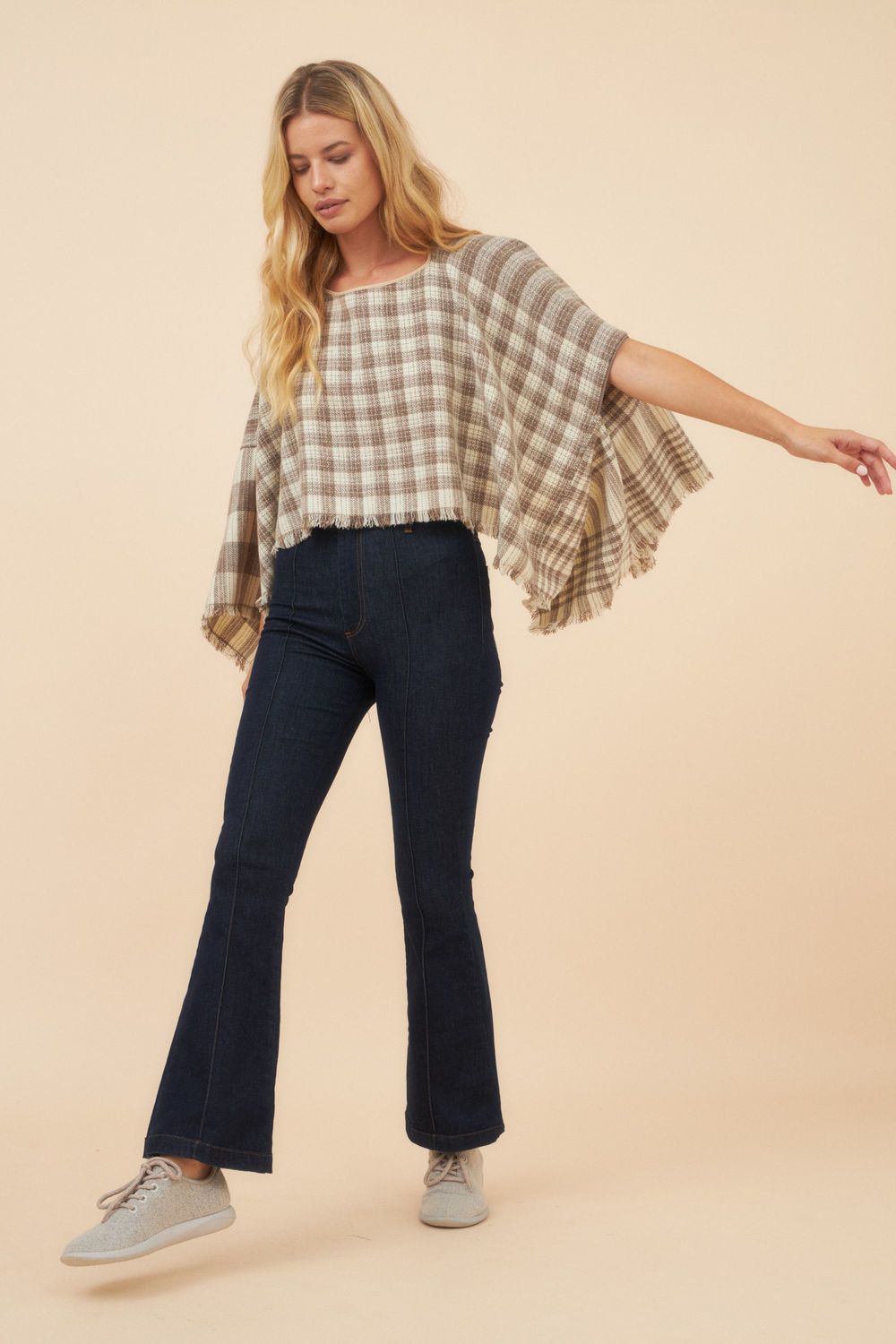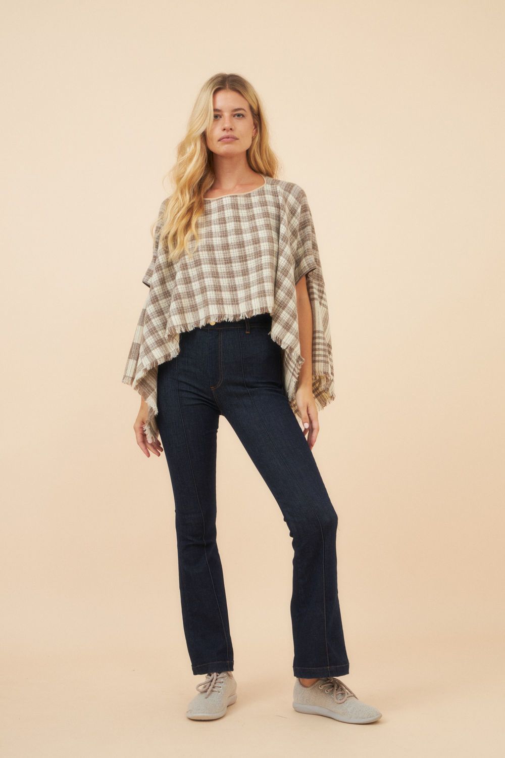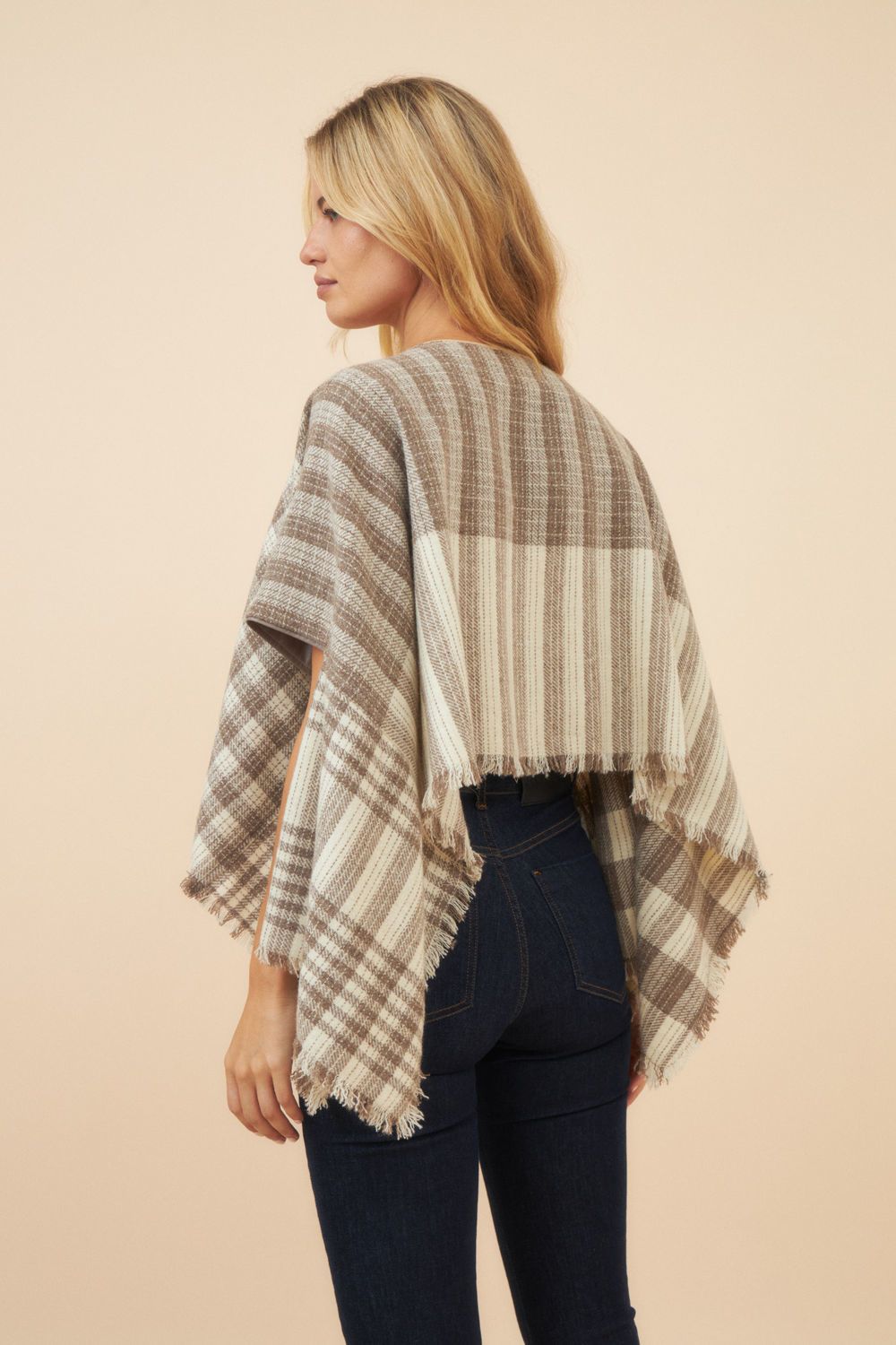 Chal moderno tipo poncho, con aberturas para los brazos en los laterales. Detalles en cuero, cuello bote y terminaciones desflecadas. Prenda elegante, que sirve para complementar tanto looks formales como casuales. Se puede usar todo el año.