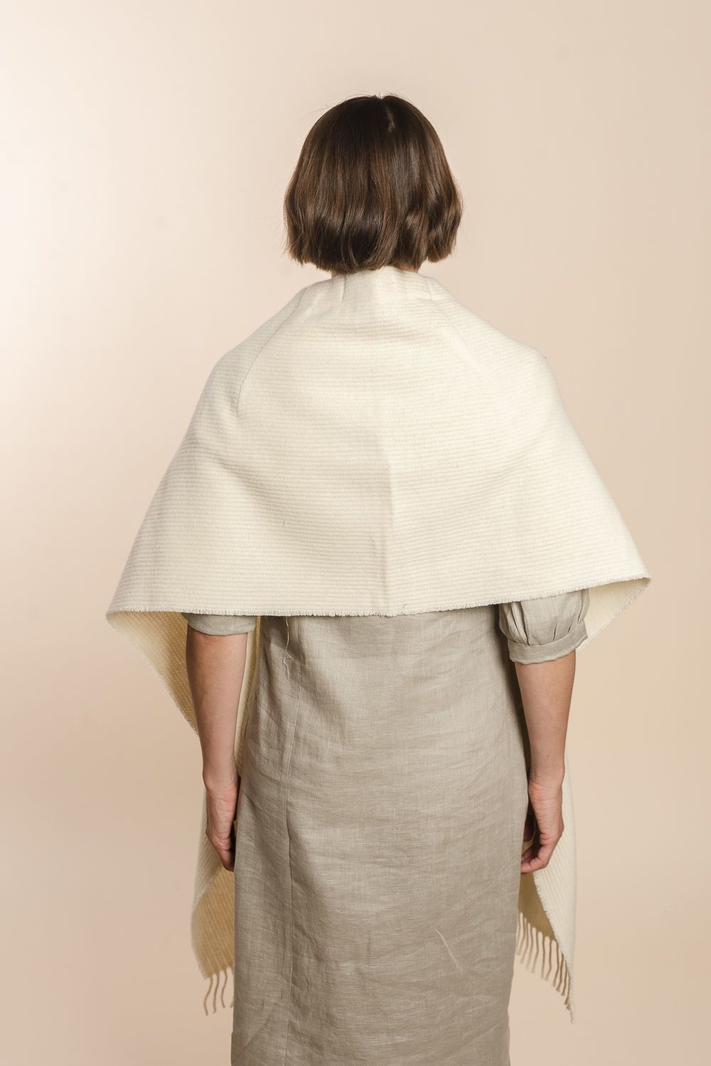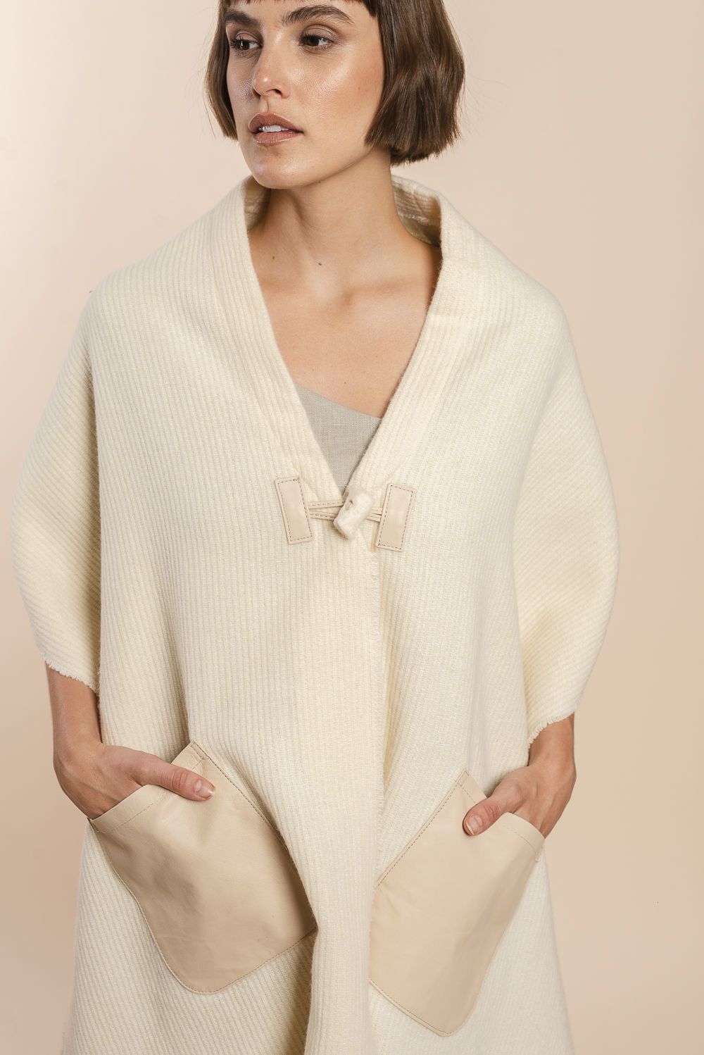 Chal con calce en hombros. Abrochadura con alamar de fieltro y bolsillos en cuero. Terminación con flecos. Prenda de uso casual. Se puede usar todo el año. Tela 100% lana fina sin teñir, diseñada exclusivamente por Don Baez. Hecha 100% en Uruguay.