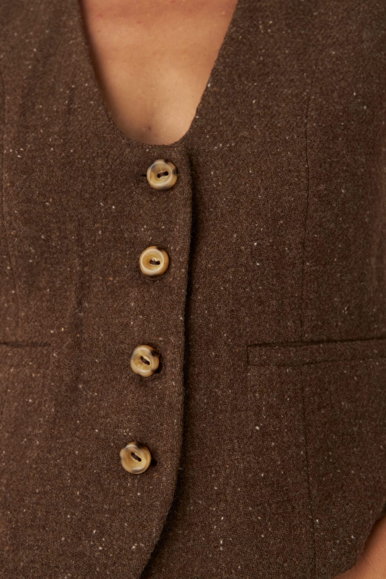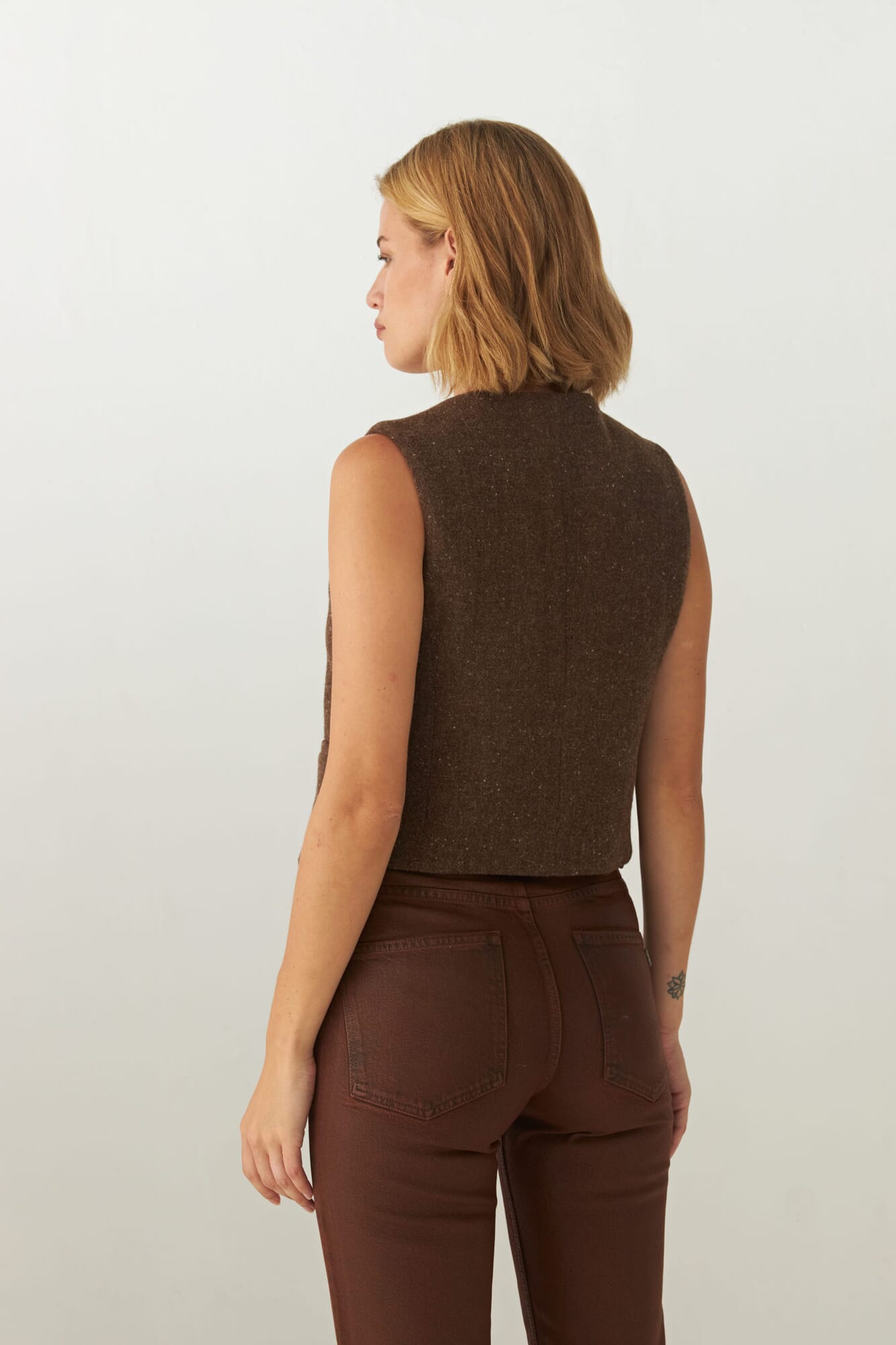 Chaleco sastre, con escote de forma redondeada y manga sisa. Forro interior a