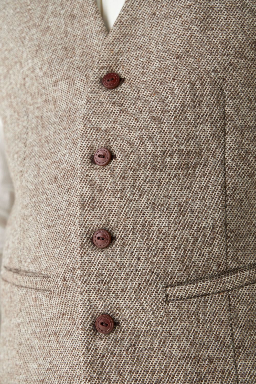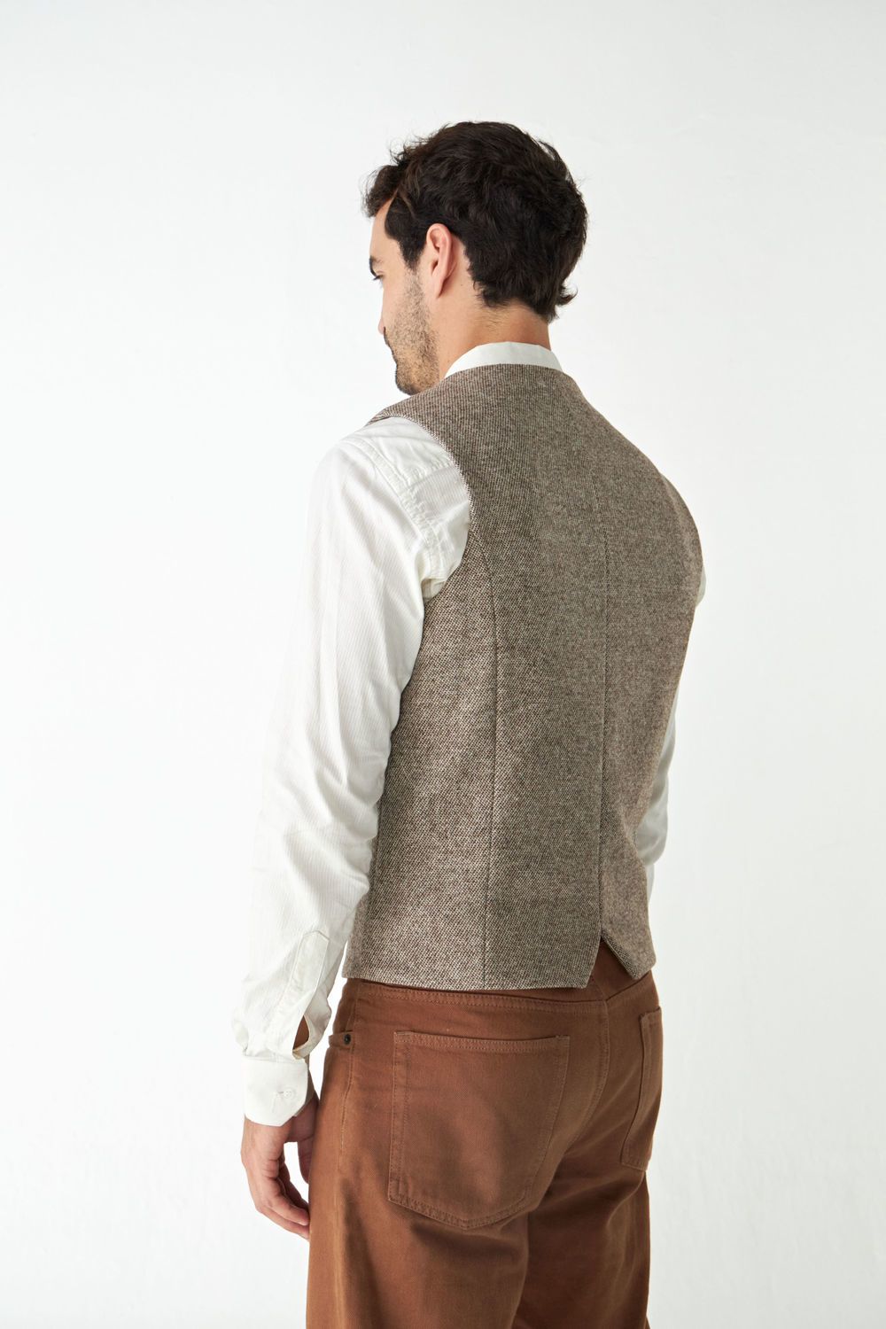 Chaleco masculino, sastre, forrado, con detalle de bolsillos en delantera.