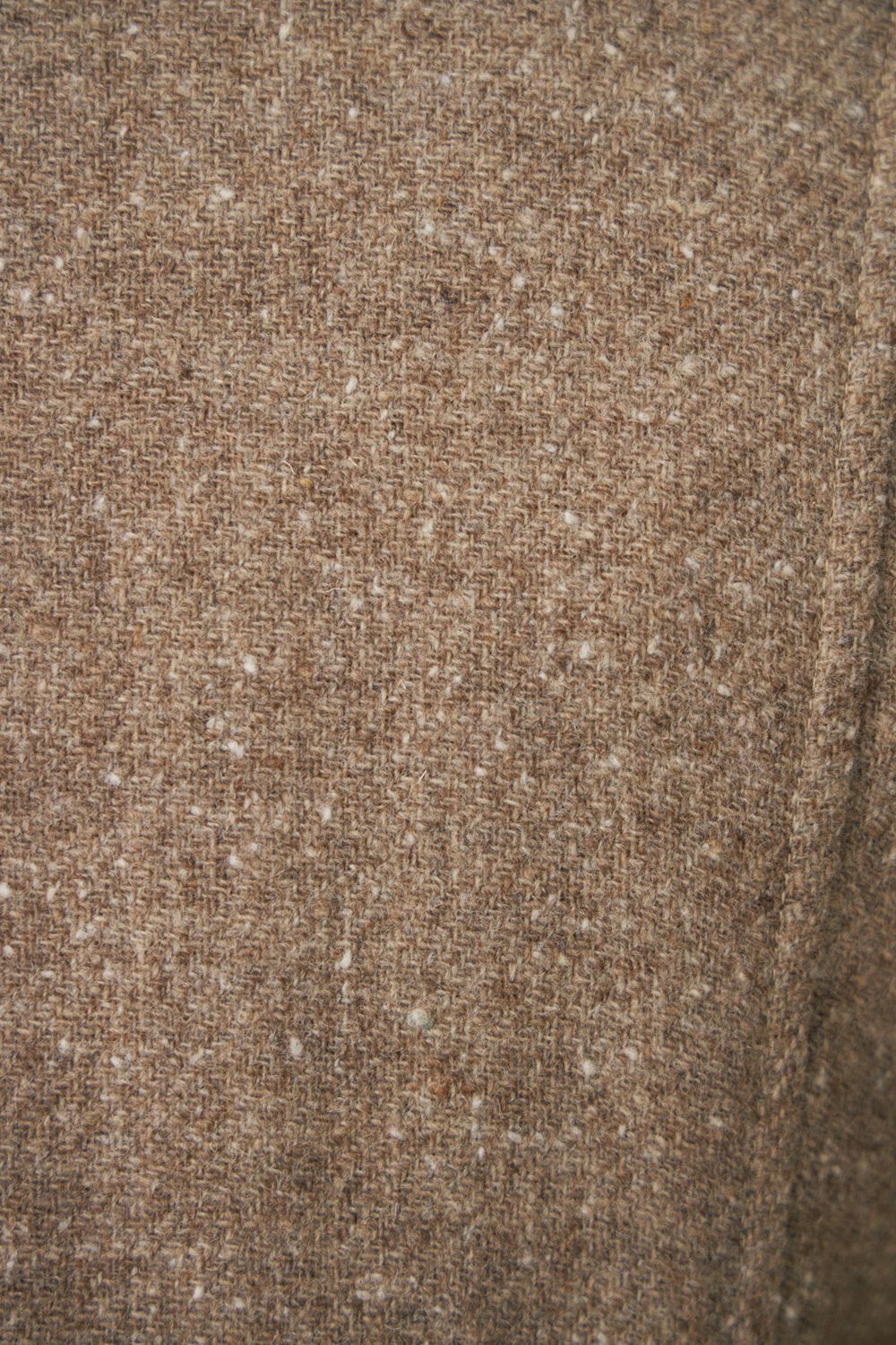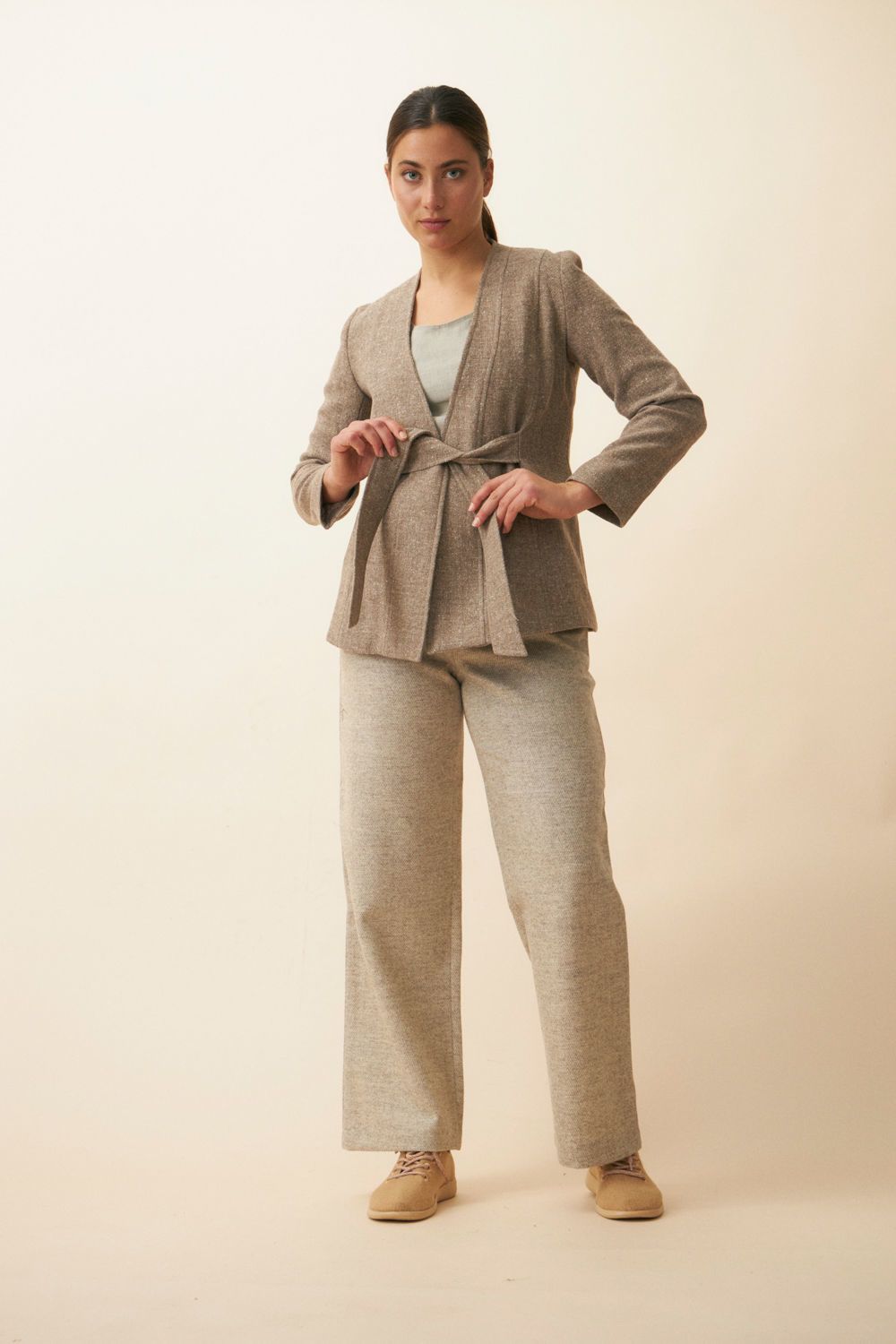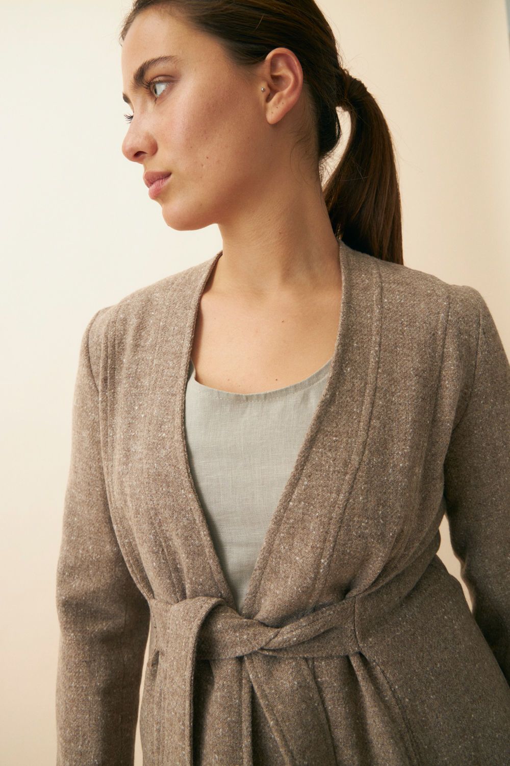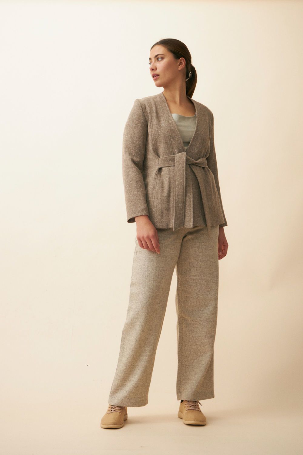 Chaqueta corta y entallada, escote v y manga larga. Cierre frontal mediante lazo fijo. Bolsillos escondidos. Sin forro, con terminaciones enviadas. Tela 100% lana fina sin teñir, diseñada exclusivamente por Don Baez. Hecha 100% en Uruguay.
