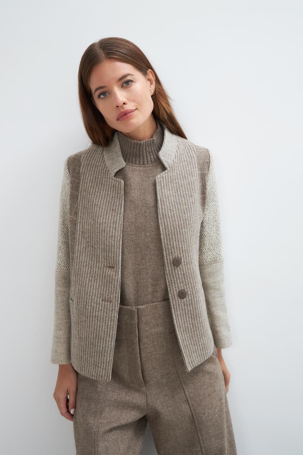 Chaqueta corta con cuello solapa y diseño con patchwork de telas. Manga larga con detalle de coderas aplicadas. Cierre frontal mediante botones. Bolsillos ojal. Con forro. Tela 100% lana fina sin teñir, diseñada exclusivamente por Don Baez. Hecha 100% en Uruguay.