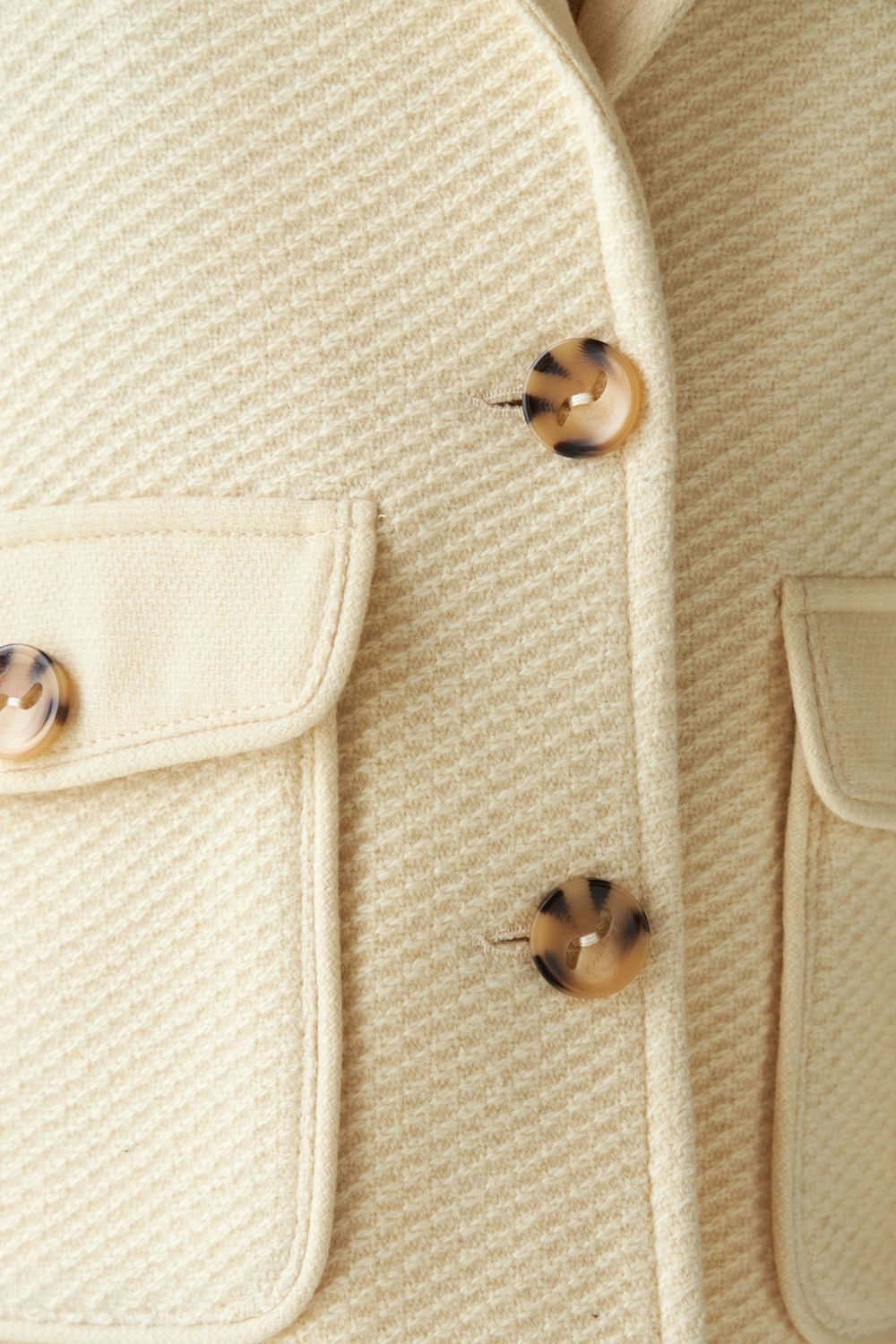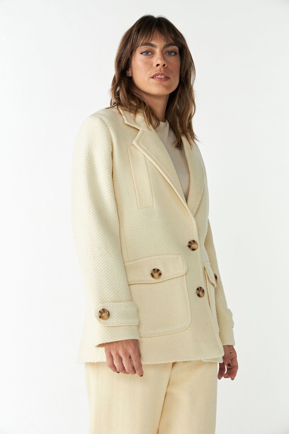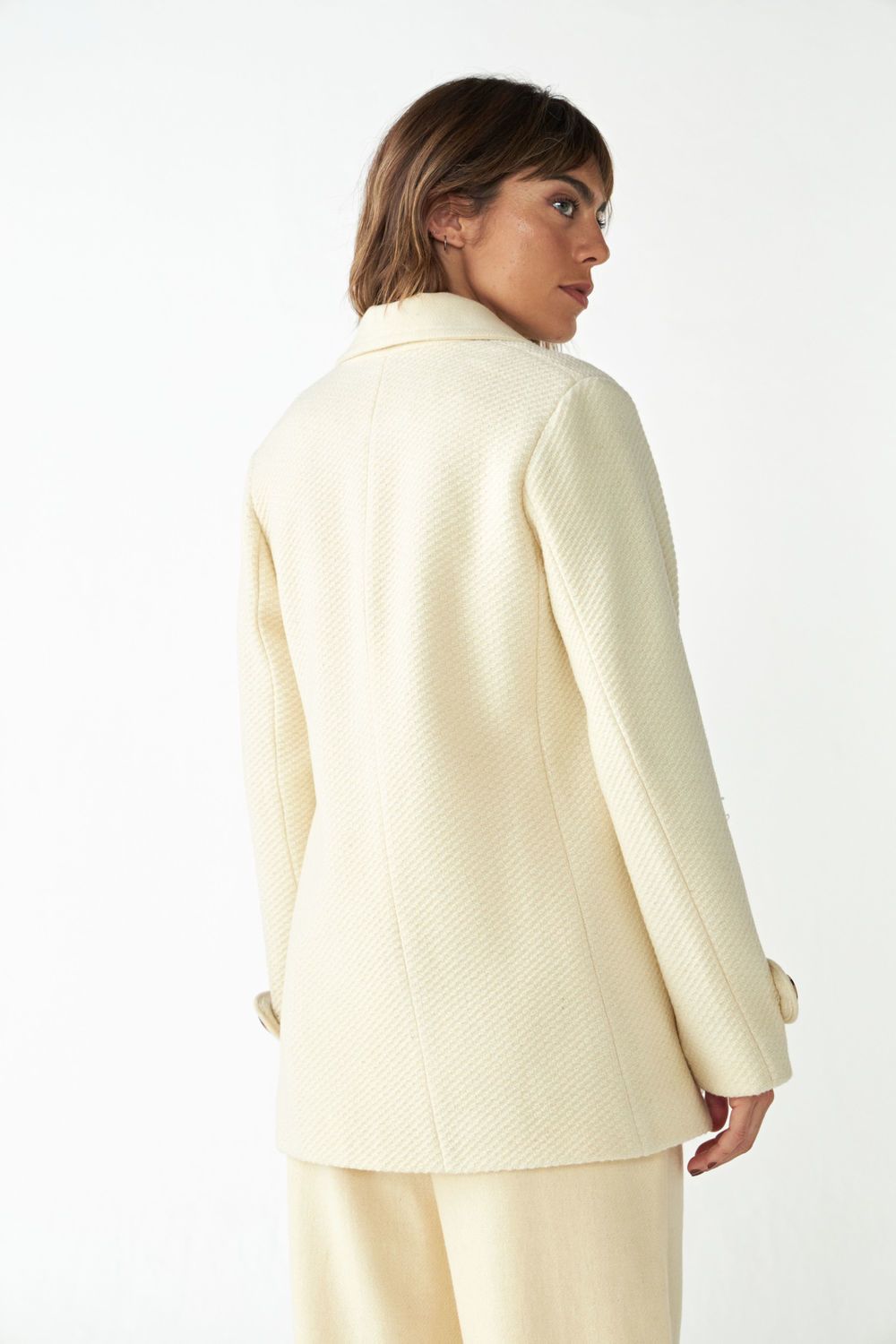Abrigo de cuello sastre, con forro. Cierre frontal con botones, detalle de bolsillos en