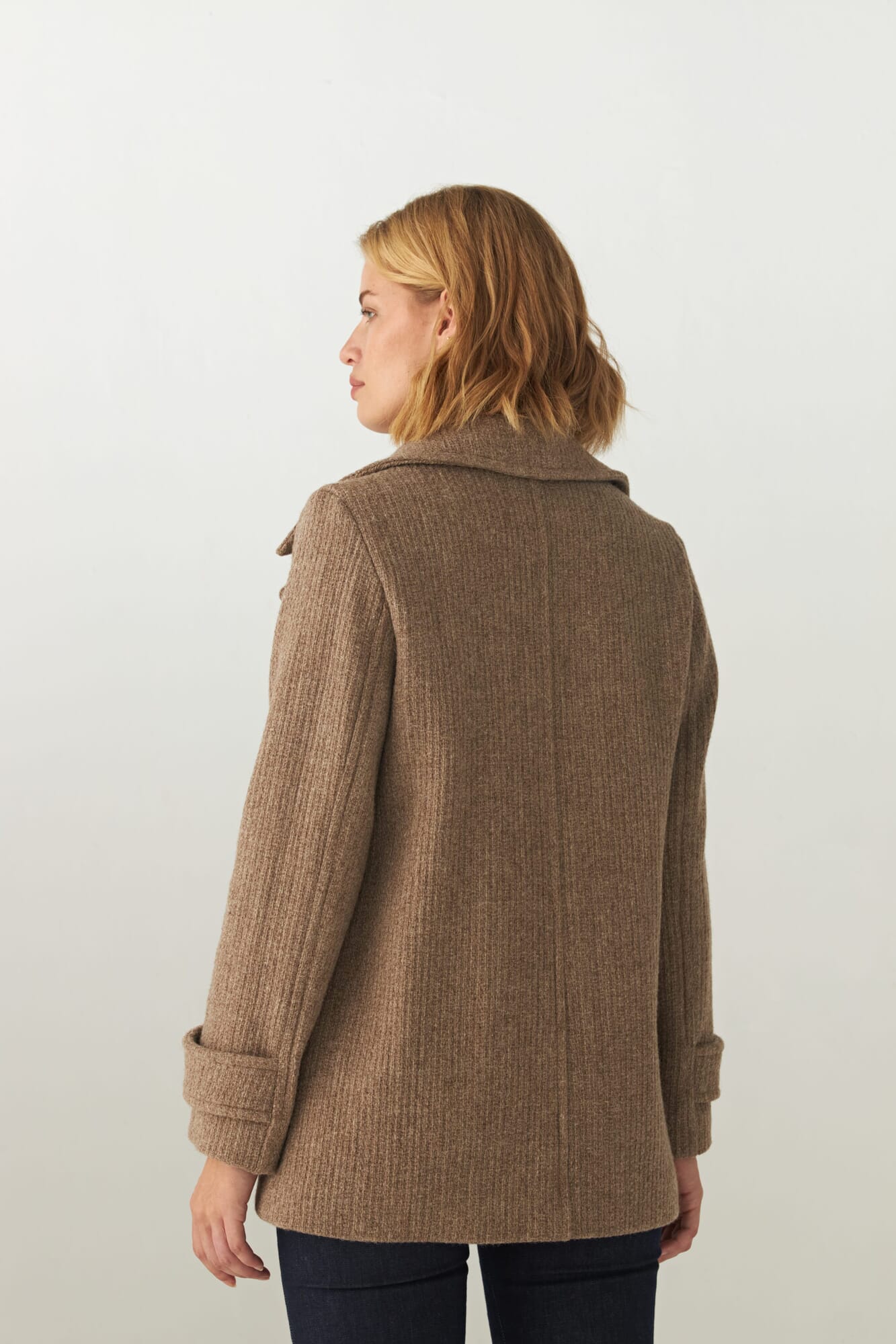 Chaquetón con cuello, abrochadura simple, con botón en el cuello. Bolsillos ojal. Detalle de martingala en mangas. Prenda con forro al tono.Hecha 100% de lana fina sin teñir, diseñada exclusivamente por Don Baez. Hecha 100% en Uruguay.