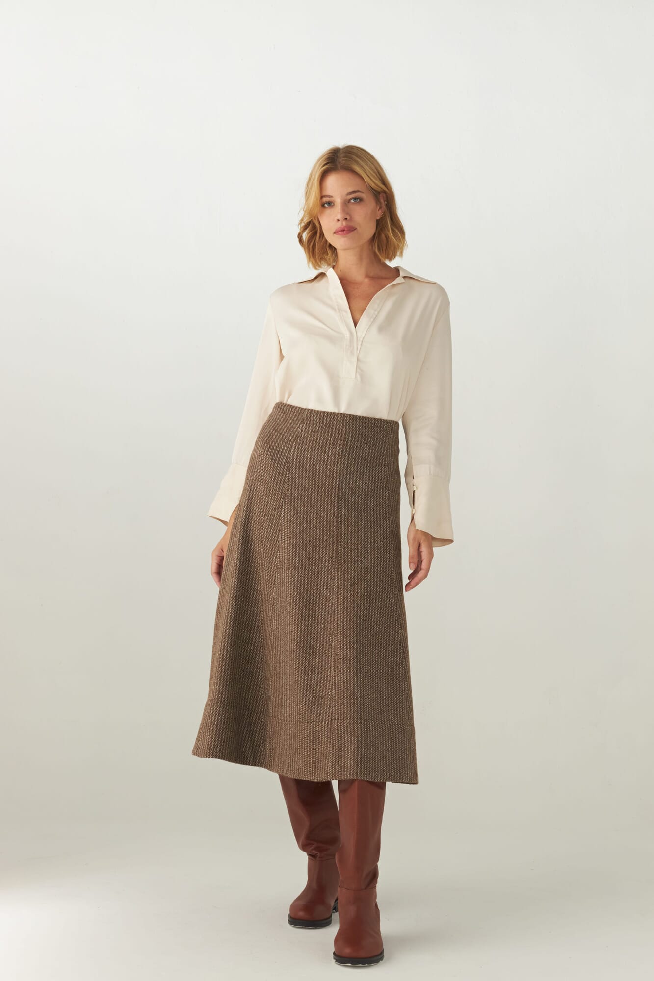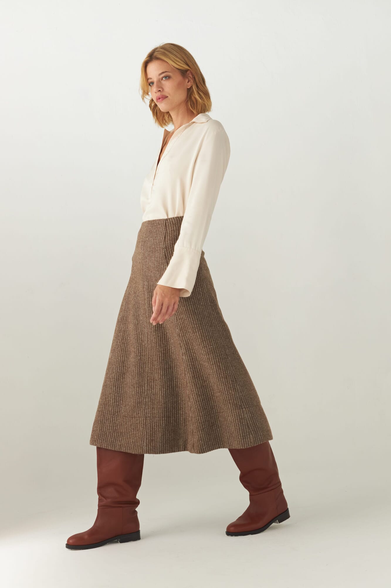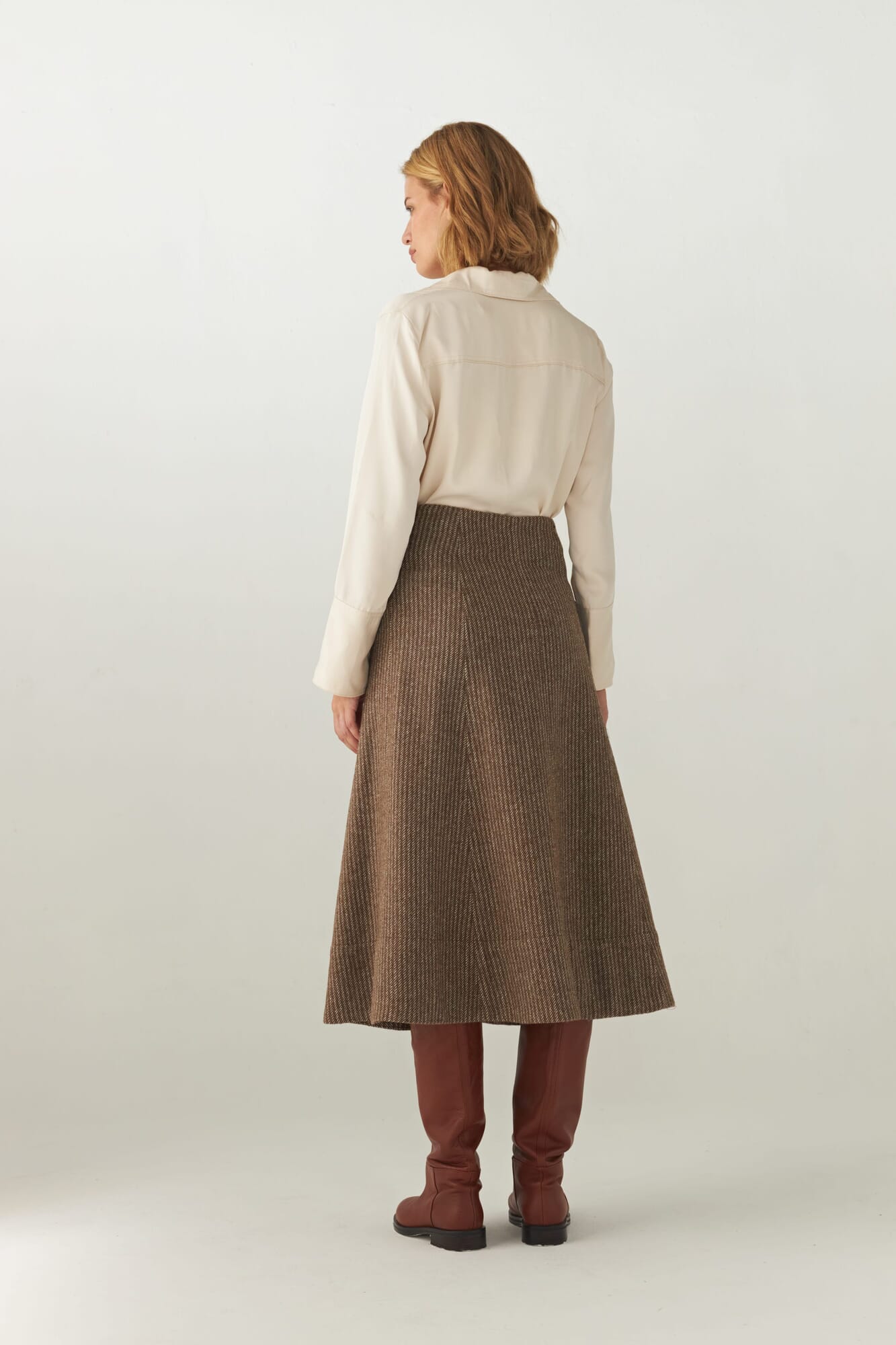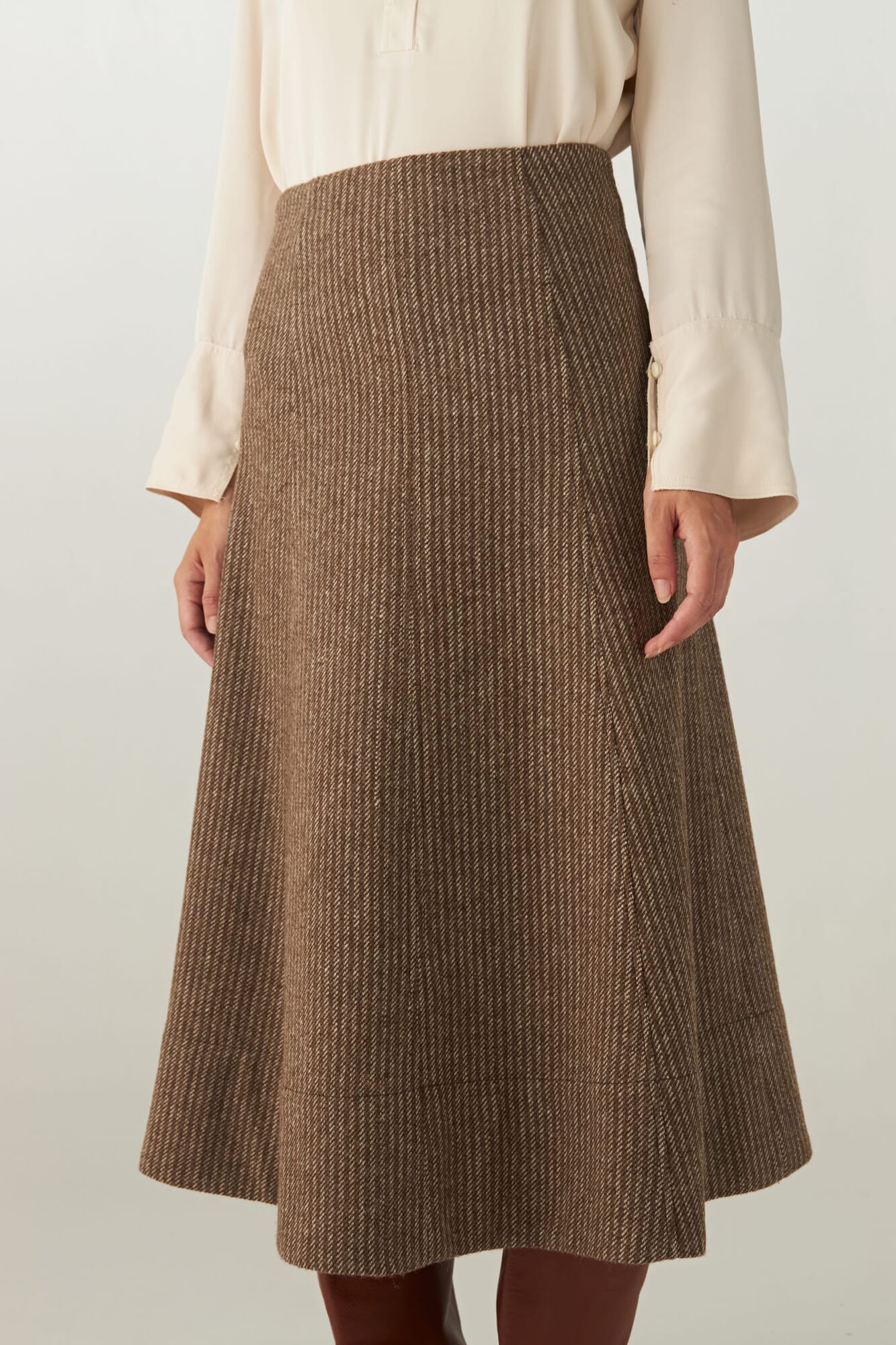 Falda evasee en gajos con detalle de pespuntes y cierre oculto.Tela 100% de lana fina sin teñir, diseñada exclusivamente por Don Baez. Hecha 100% en Uruguay.