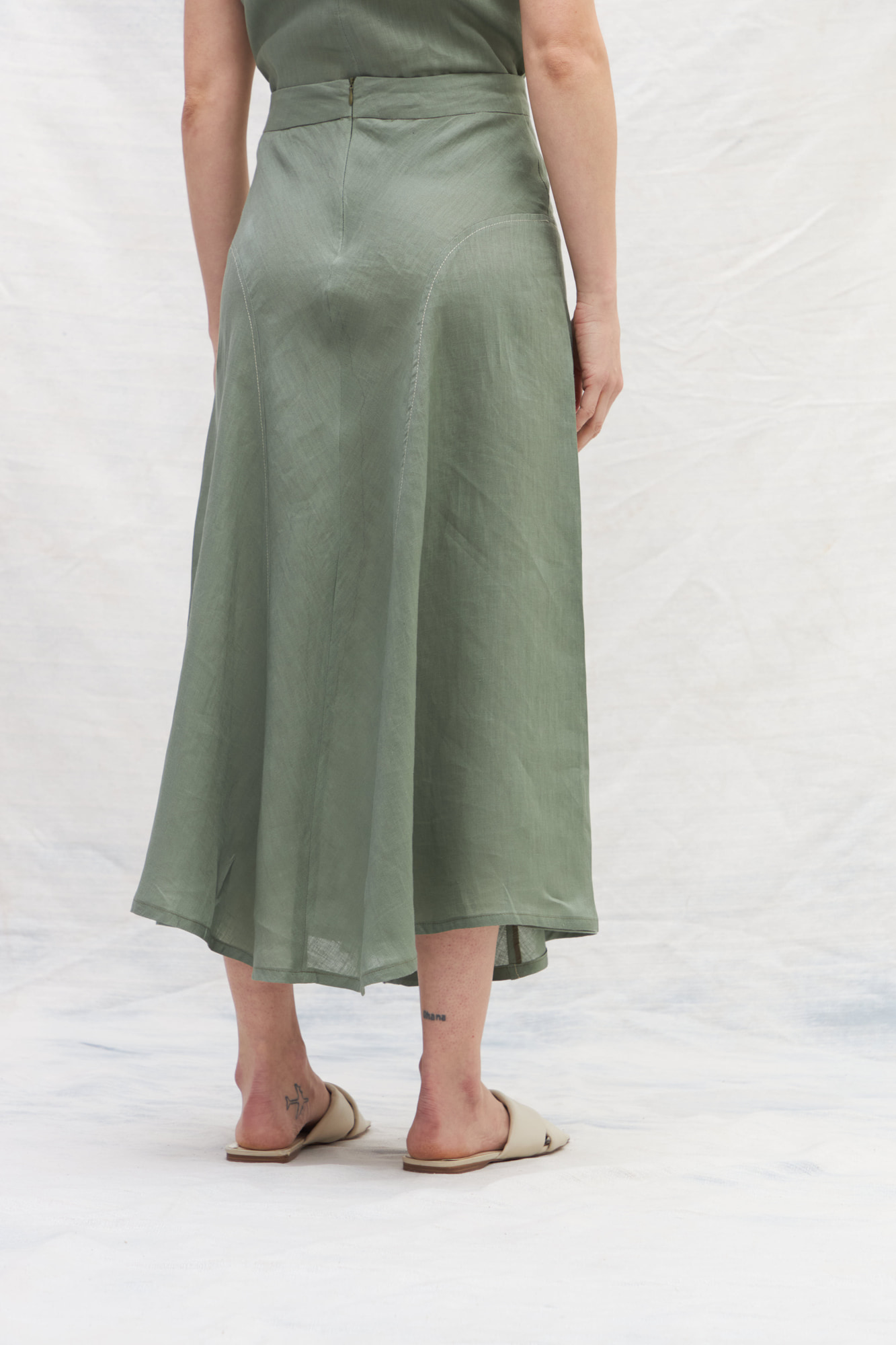 Falda midi de lino a la cintura, fresca y con cortes curvos. Los pespuntes a contratono realzan la silueta y el movimiento fluido de la prenda. Ideal para combinar con el Top Arco.
