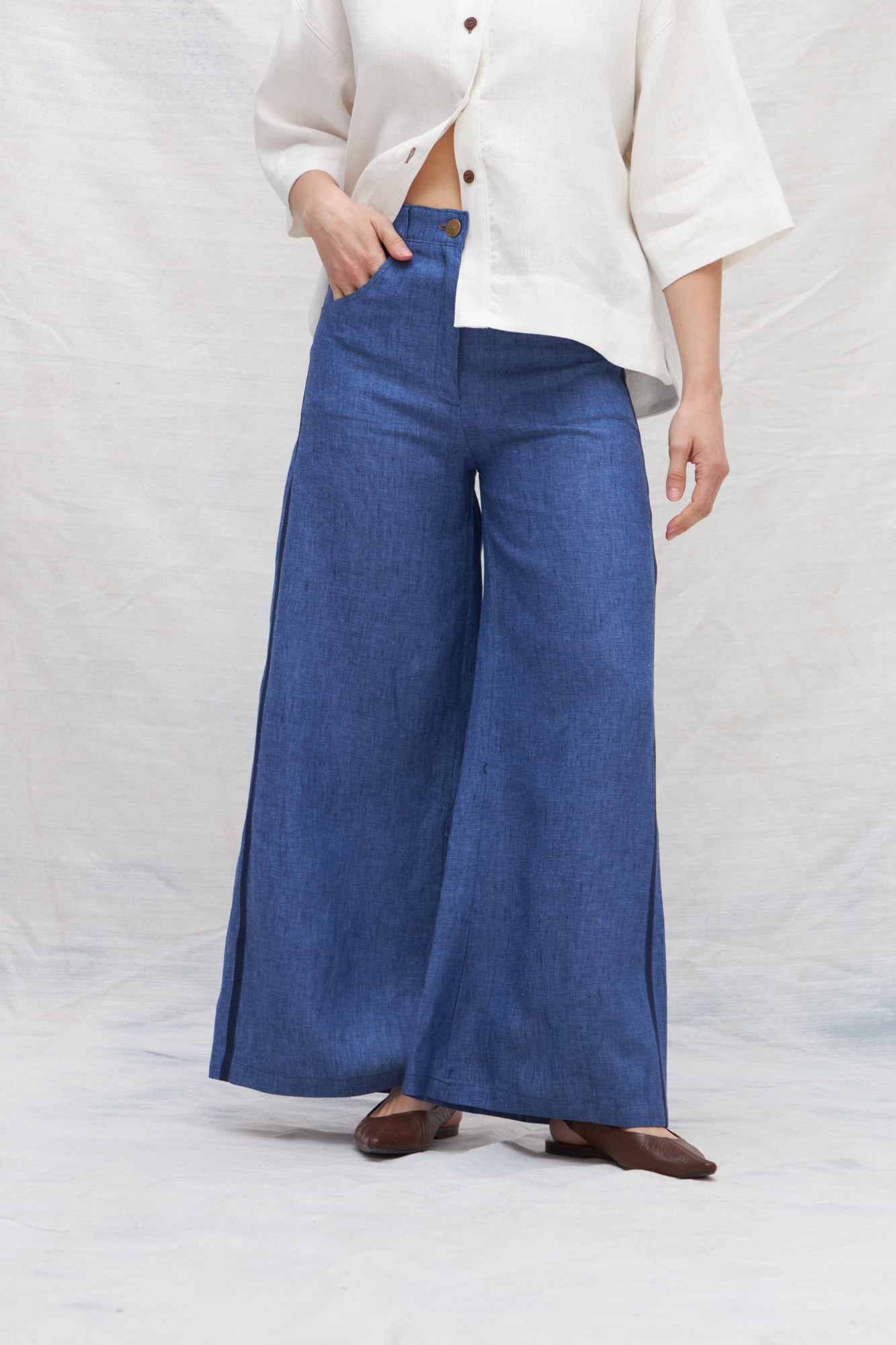 Pantalón de lino con corte jeanero y bolsillos plaque en la trasera. Los laterales llevan una dupla de cintas a contratono que aportan un detalle distintivo y estilizan la figura. Un básico versátil para combinar con todo