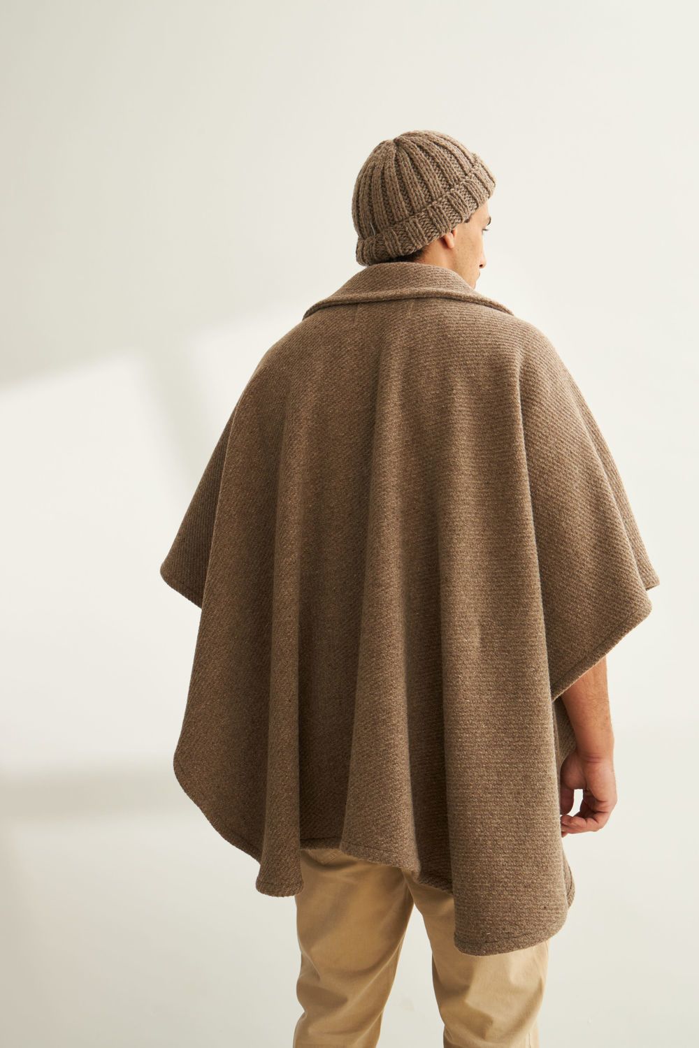 Poncho con cuello y cuadrado aplicado con broche a presión. Prenda unisex, de estilo campestre. Peso 1,270kg. Tela 100% lana fina sin teñir, diseñada exclusivamente por Don Baez. Hecha 100% en Uruguay.