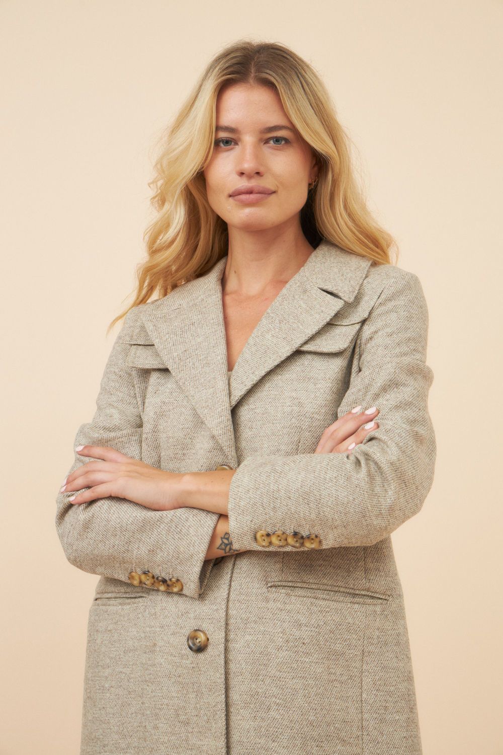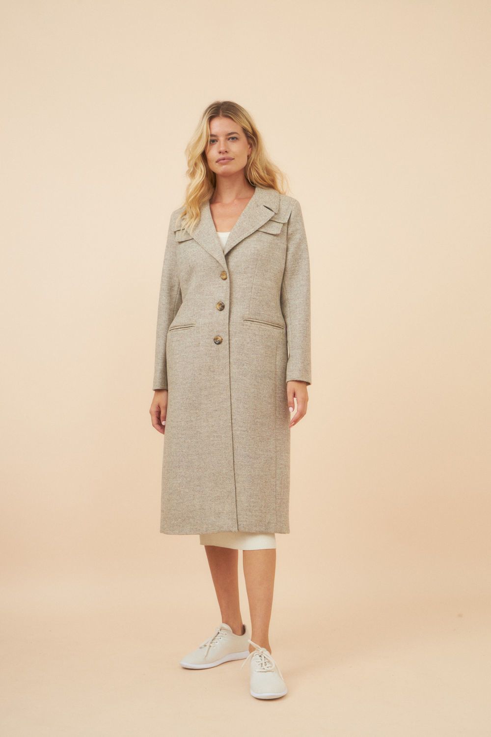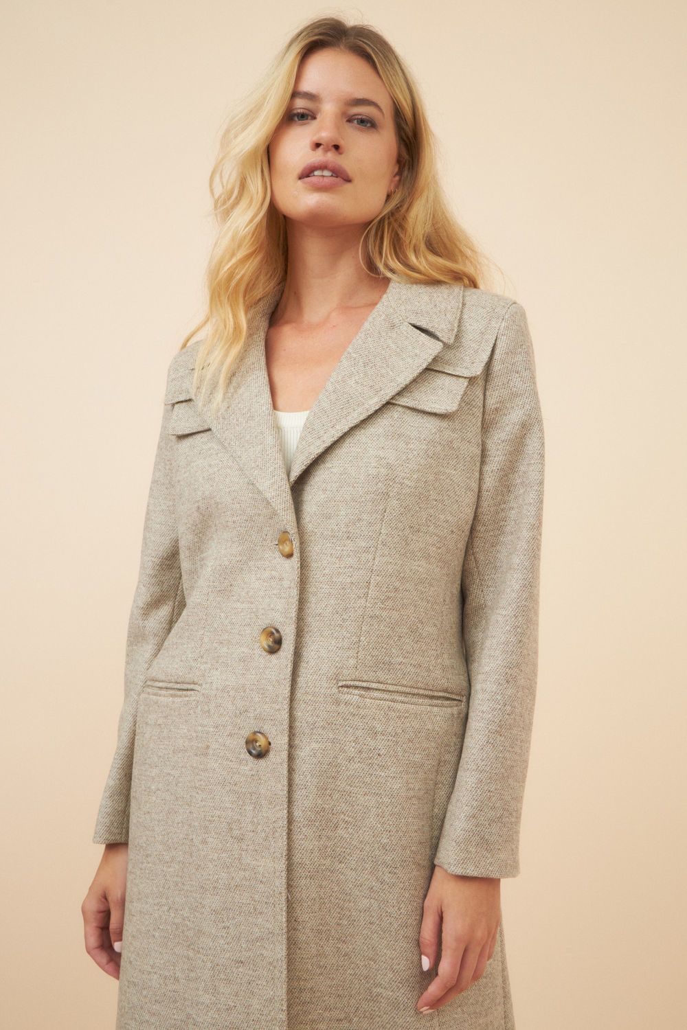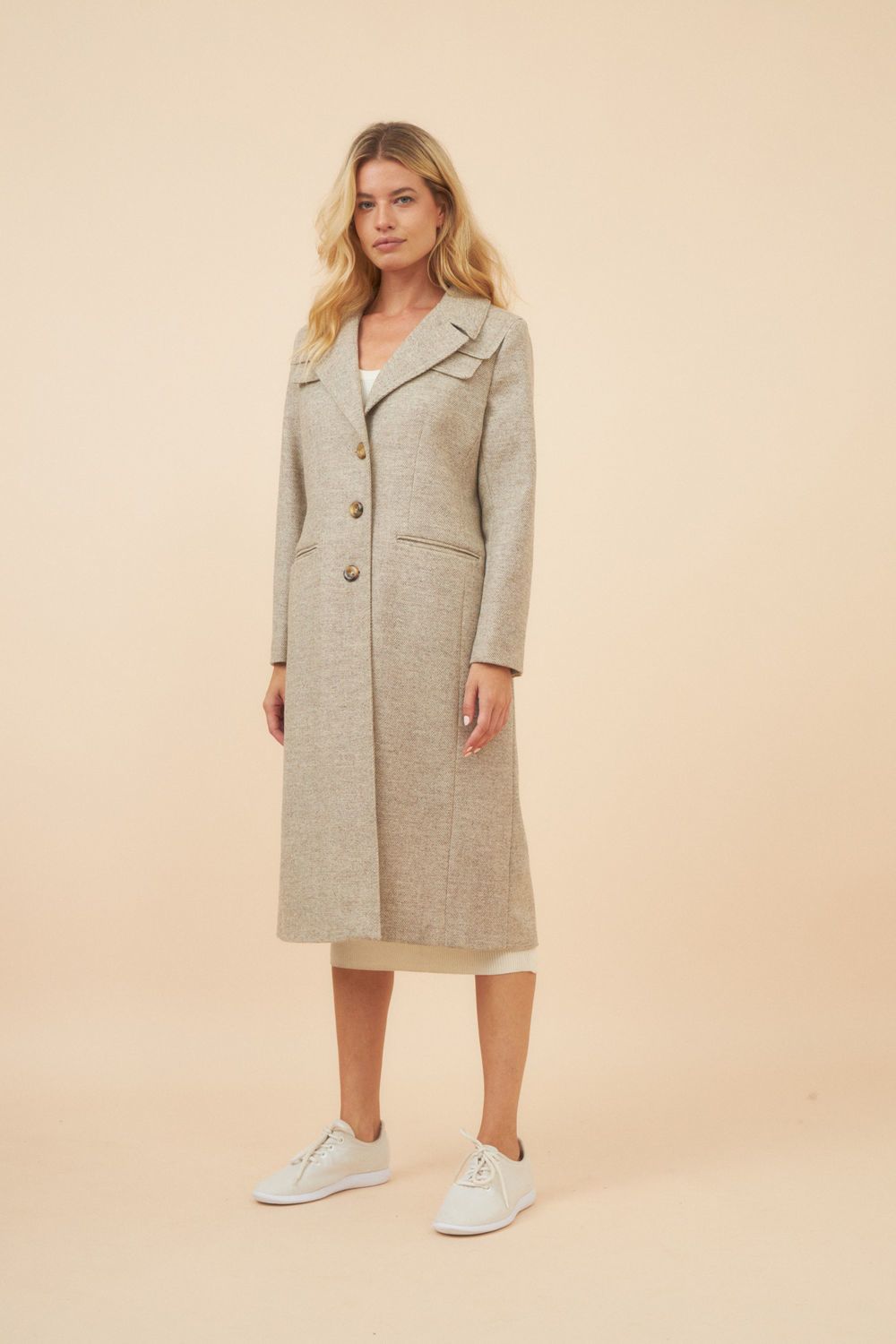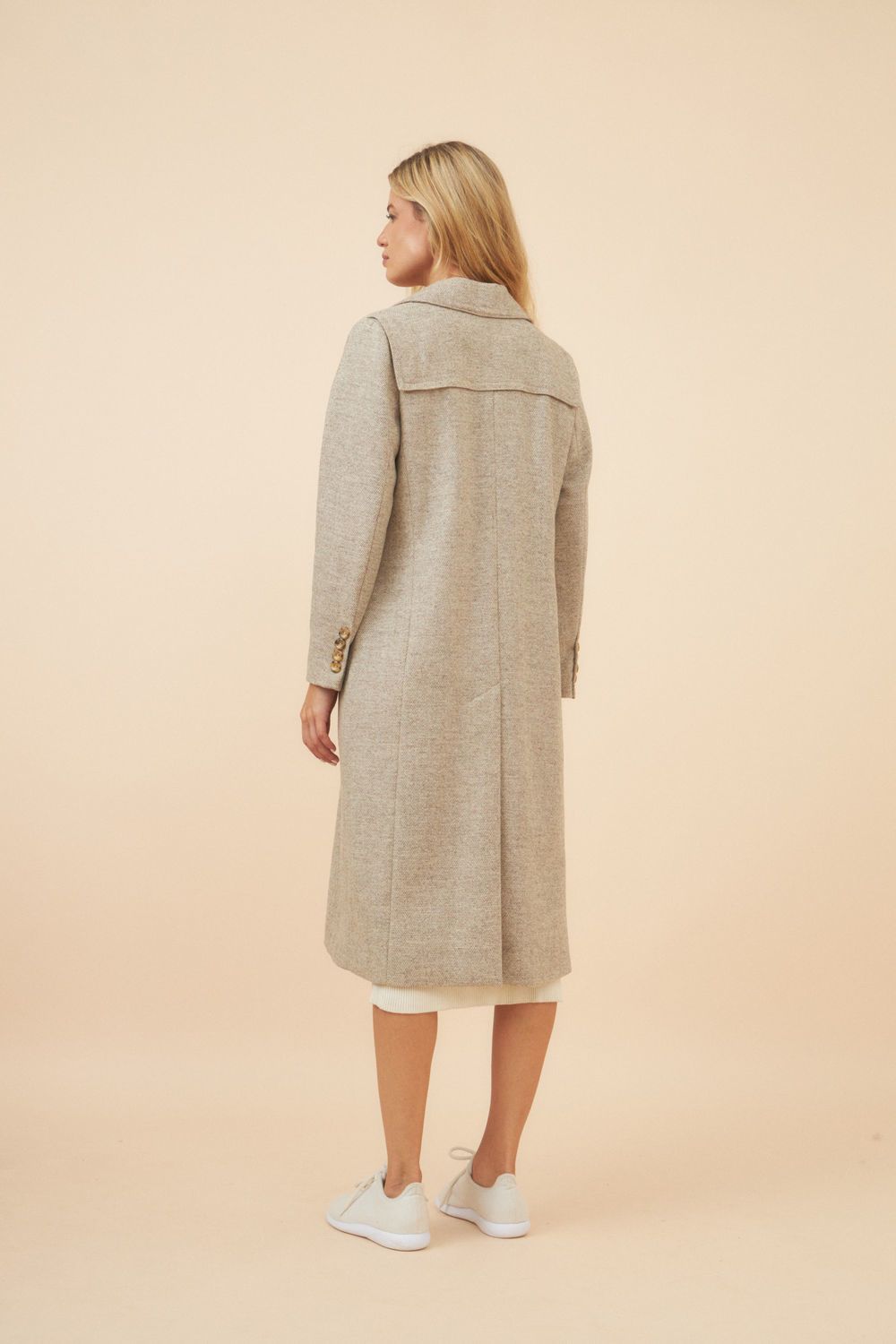 Tapado largo con cuello solapa y corte recto. Cierre frontal con botones y detalles aplicados en parte delantera. Tajo en espalda y bolsillos ojal con tapa. Con forro.