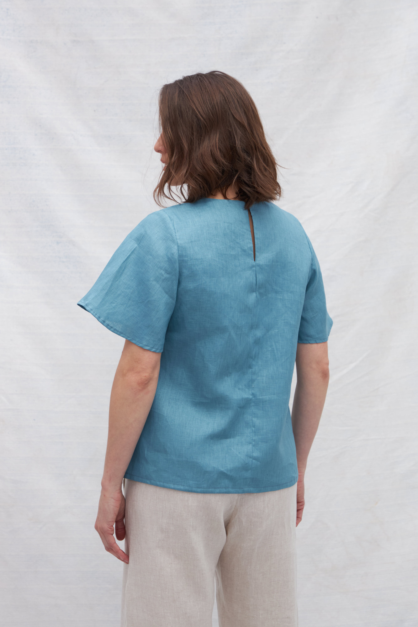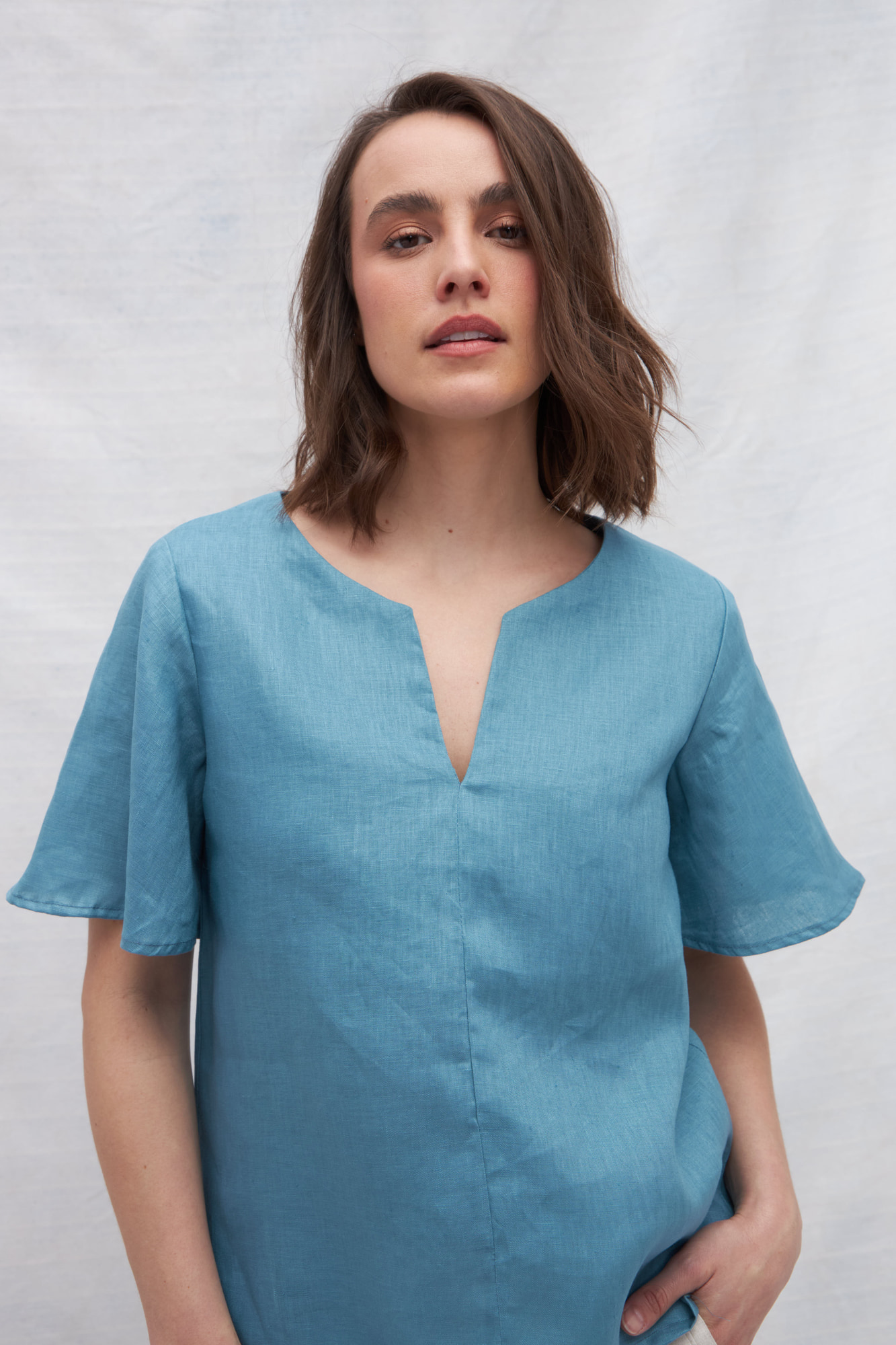 Top de lino con tajo en el escote y mangas cortas con amplitud, que aportan fluidez al movimiento. Un básico versátil, fácil de combinar en diferentes ocasiones.