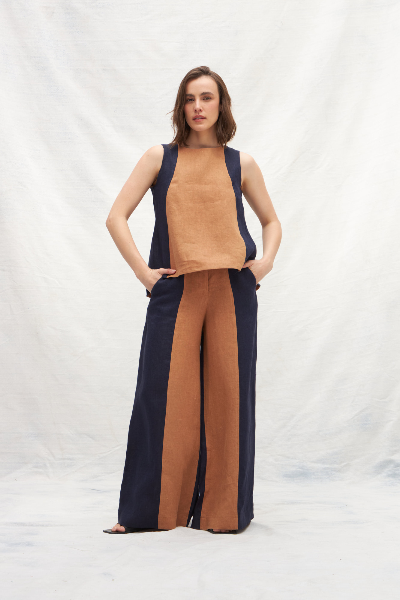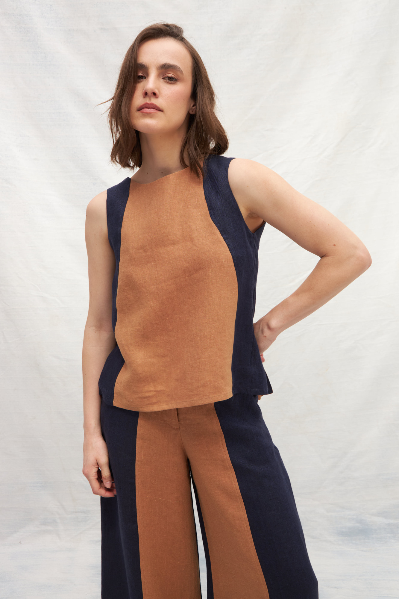 Top de lino con cortes curvos en dos tonos que generan una silueta estilizada. La espalda suma interés con dos pliegues y un escote sutil. Se abotona en la espalda.
