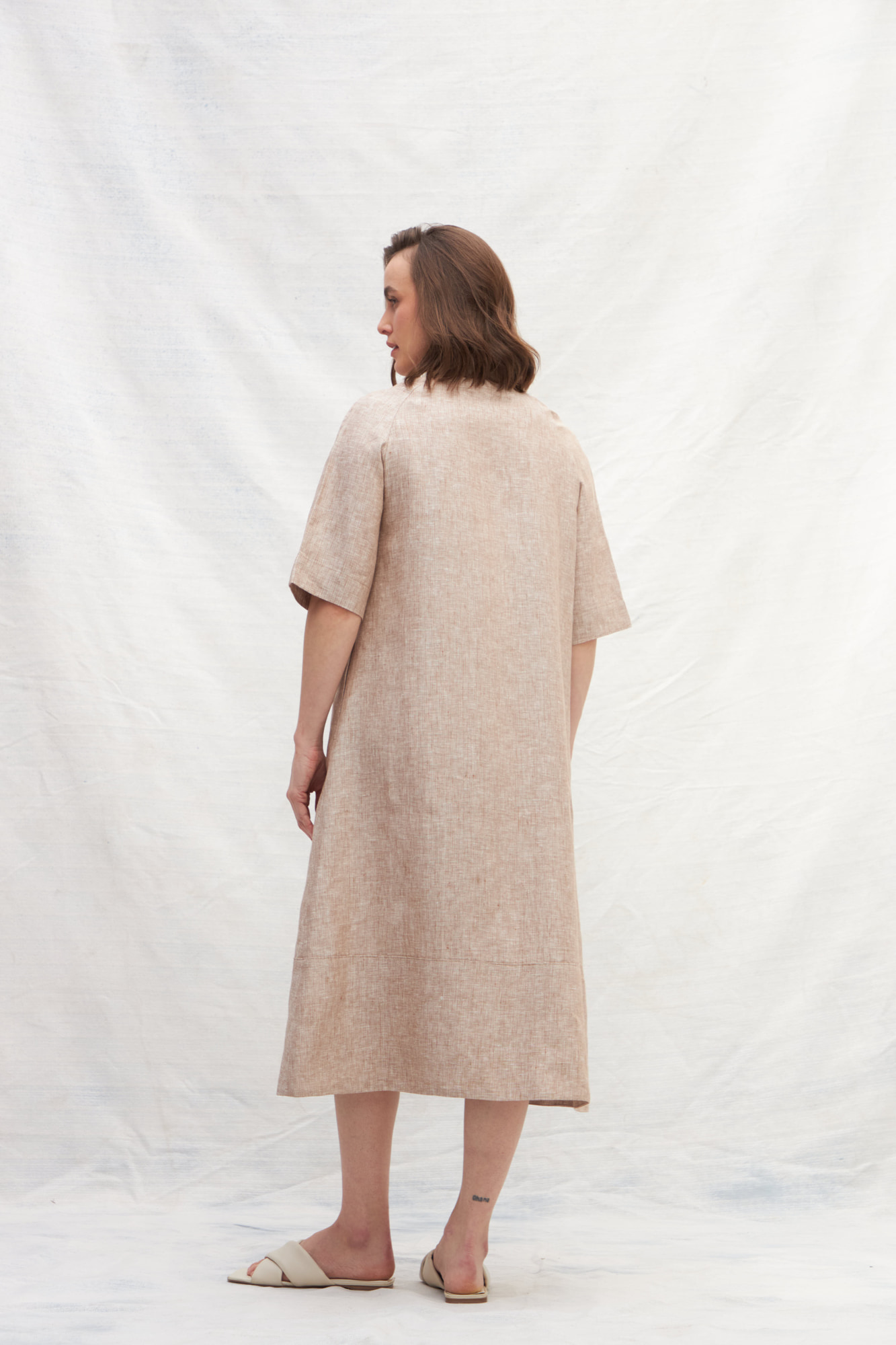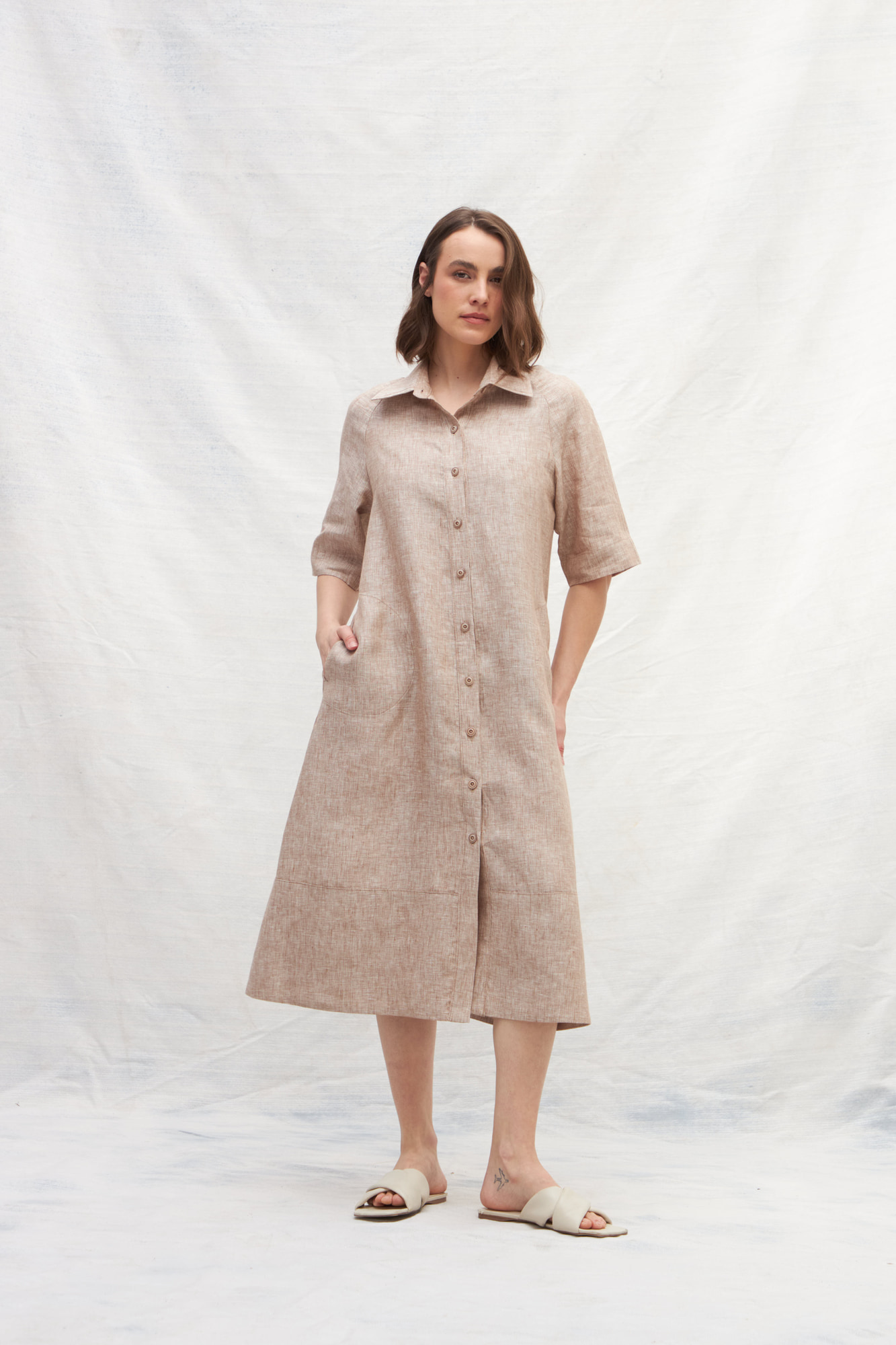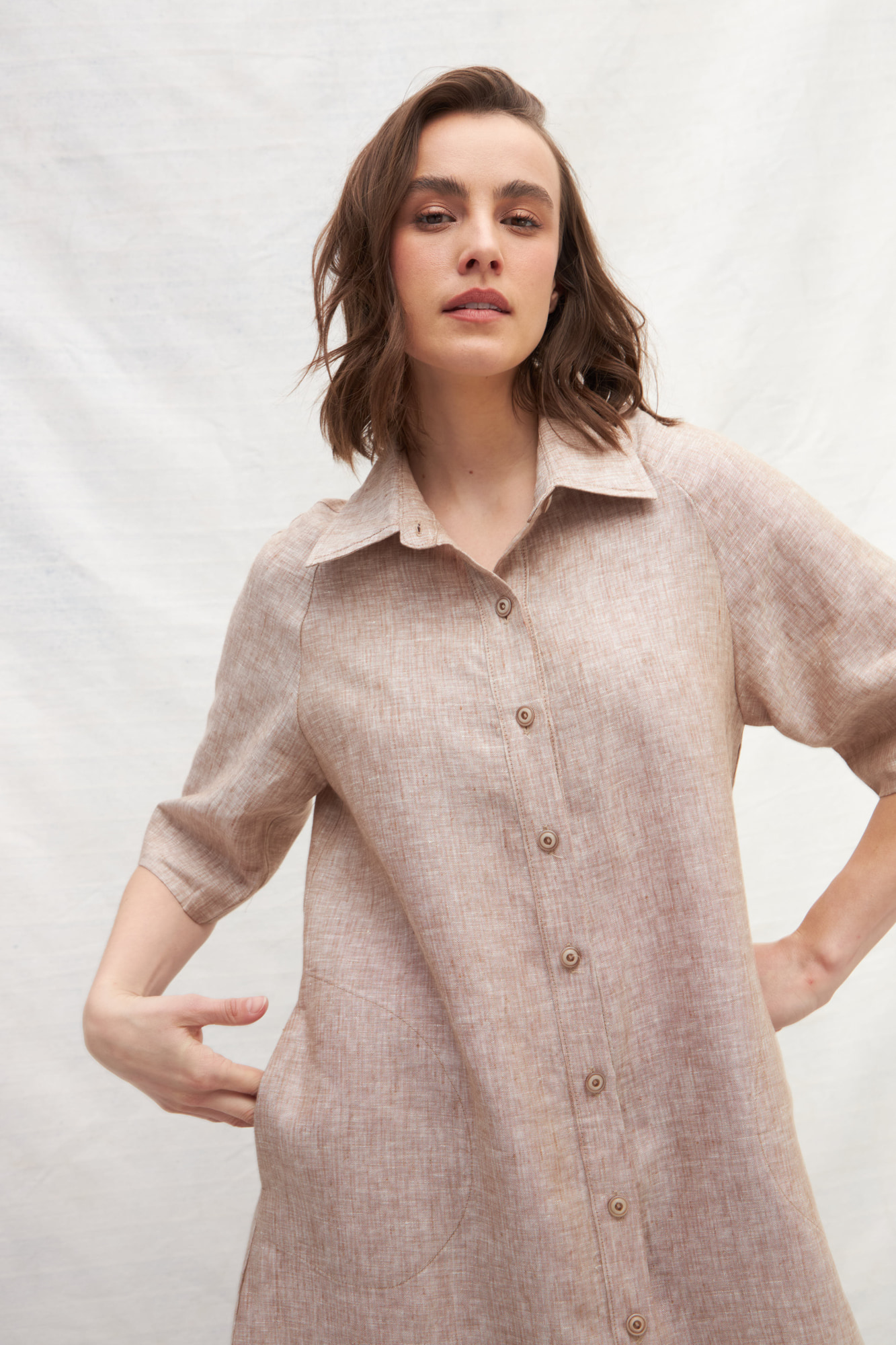 Vestido camisero de lino con abotonadura frontal completa. Manga ranglan, bolsillos laterales y un volante en el ruedo que aporta movimiento. Una silueta amplia y fresca, ideal para los días de verano
