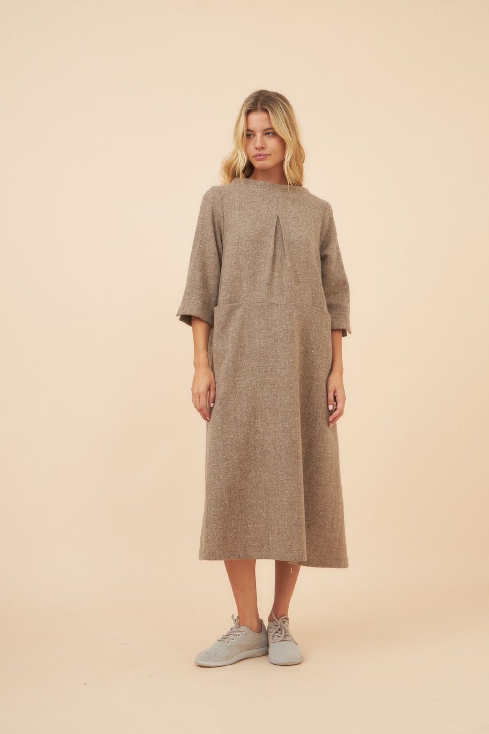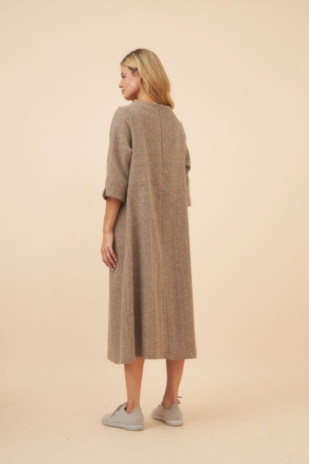 Vestido largo debajo de la rodilla, con cuello bote, bolsillos en el corte y mangas 3/4. Prenda forrada. Detalle de tajo en las mangas. Prenda elegante, para uso semi-formal.